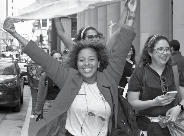 Amanda Valéria, 25, de San Rafael, saltita descendo a Rua Montgomery com uma faixa do Lula. Como Gua dalupe, hoje ela ressignifica a cami sa da seleção. Amanda Valéria, 25, of San Rafael, skips down Montgomery Street with a banner of Lula. Like Gua dalupe, today she reclaims the Brazi lian jersey.