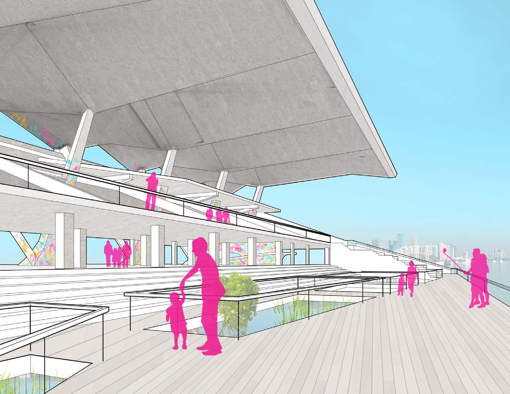 The Candela Stadium Renovation re-imagines Hilario Candela’s original Miami Marine Stadium, expressing the site’s historical context while remaining flexible to engage with Miami locals. Candela Stadium divides into three distinct levels in anticipation of future flooding. The lowest level carves out interactive tidal pools to promote native biodiversity and connects to the second level with flexible stadium seating reminiscent of the stadium’s original design.