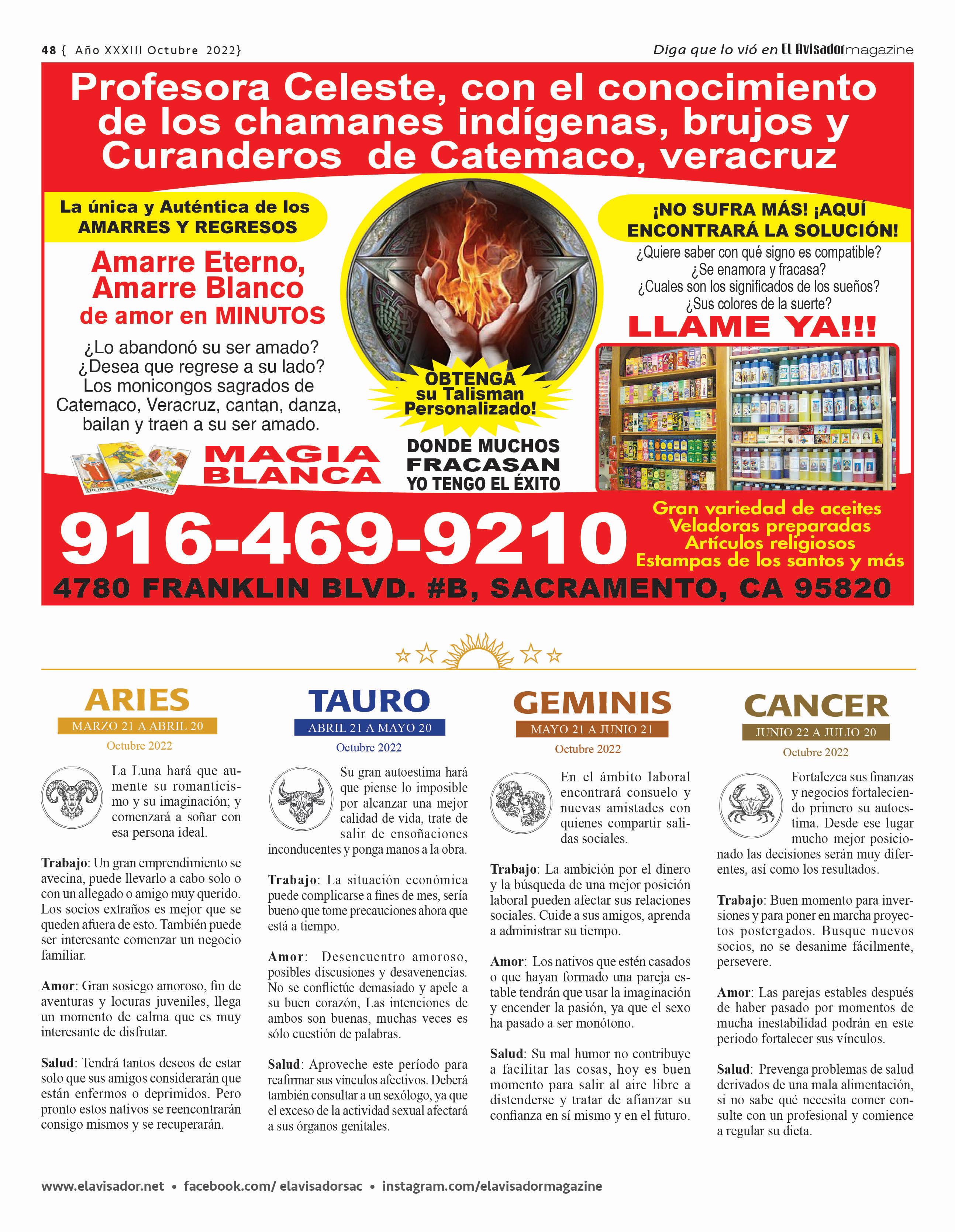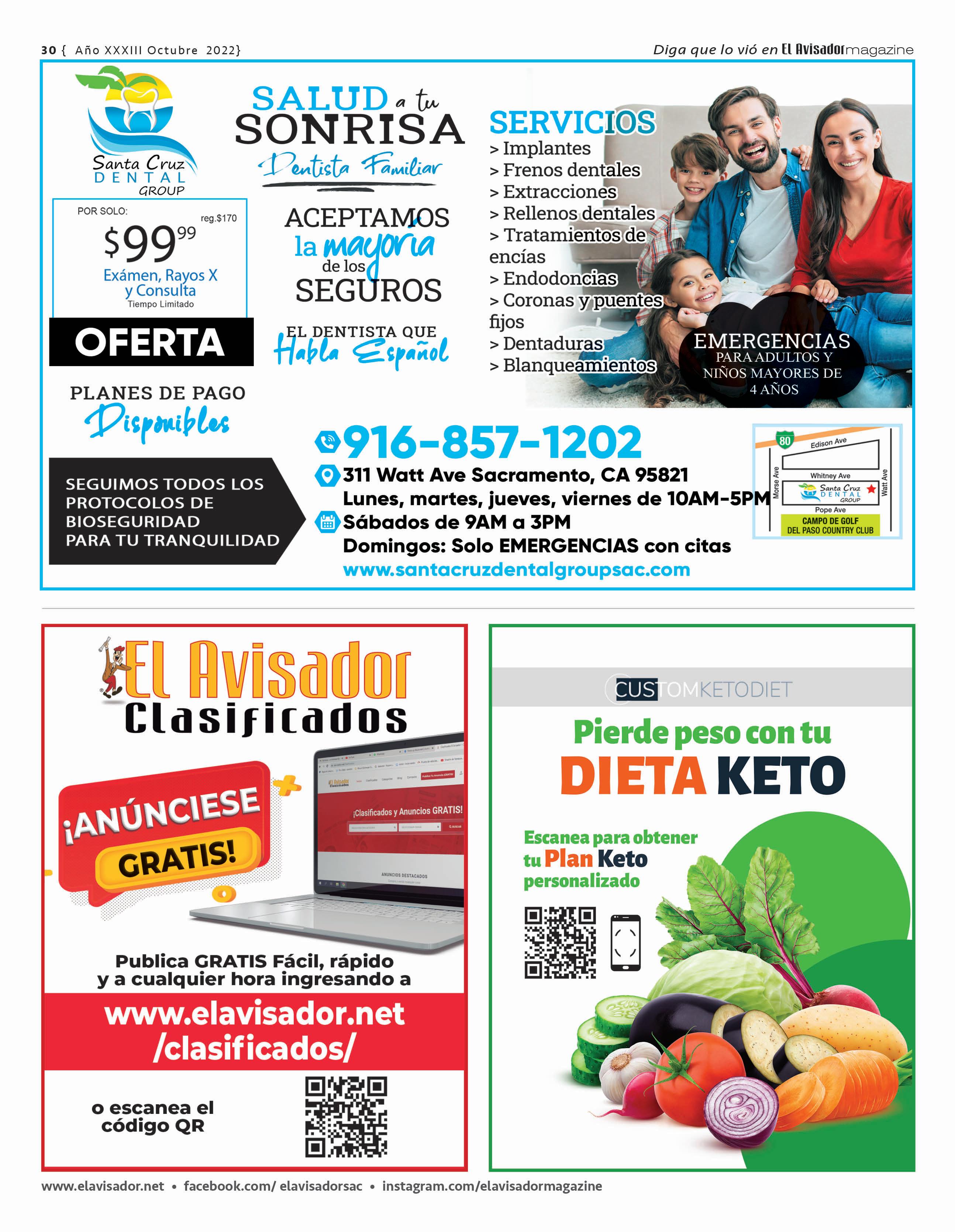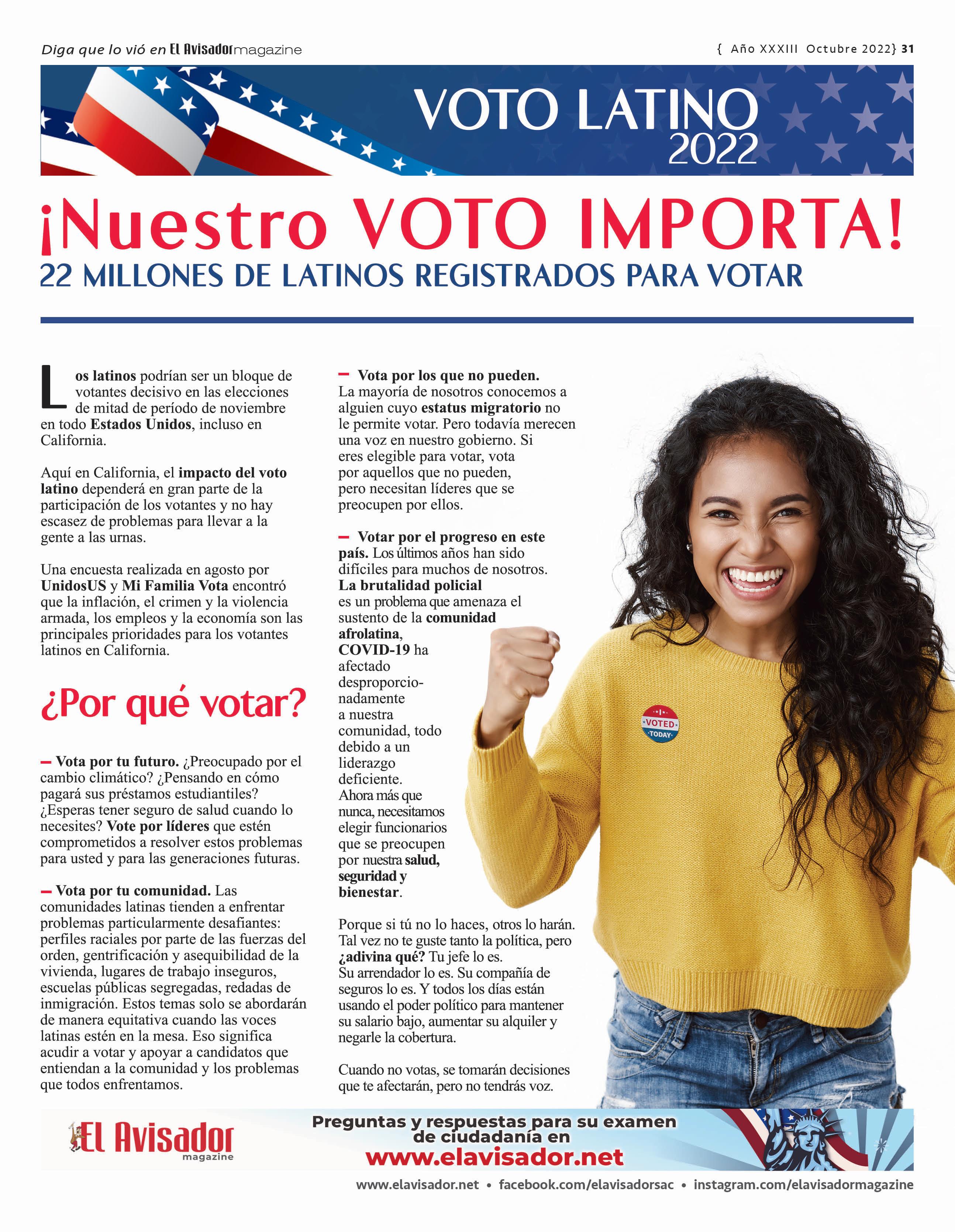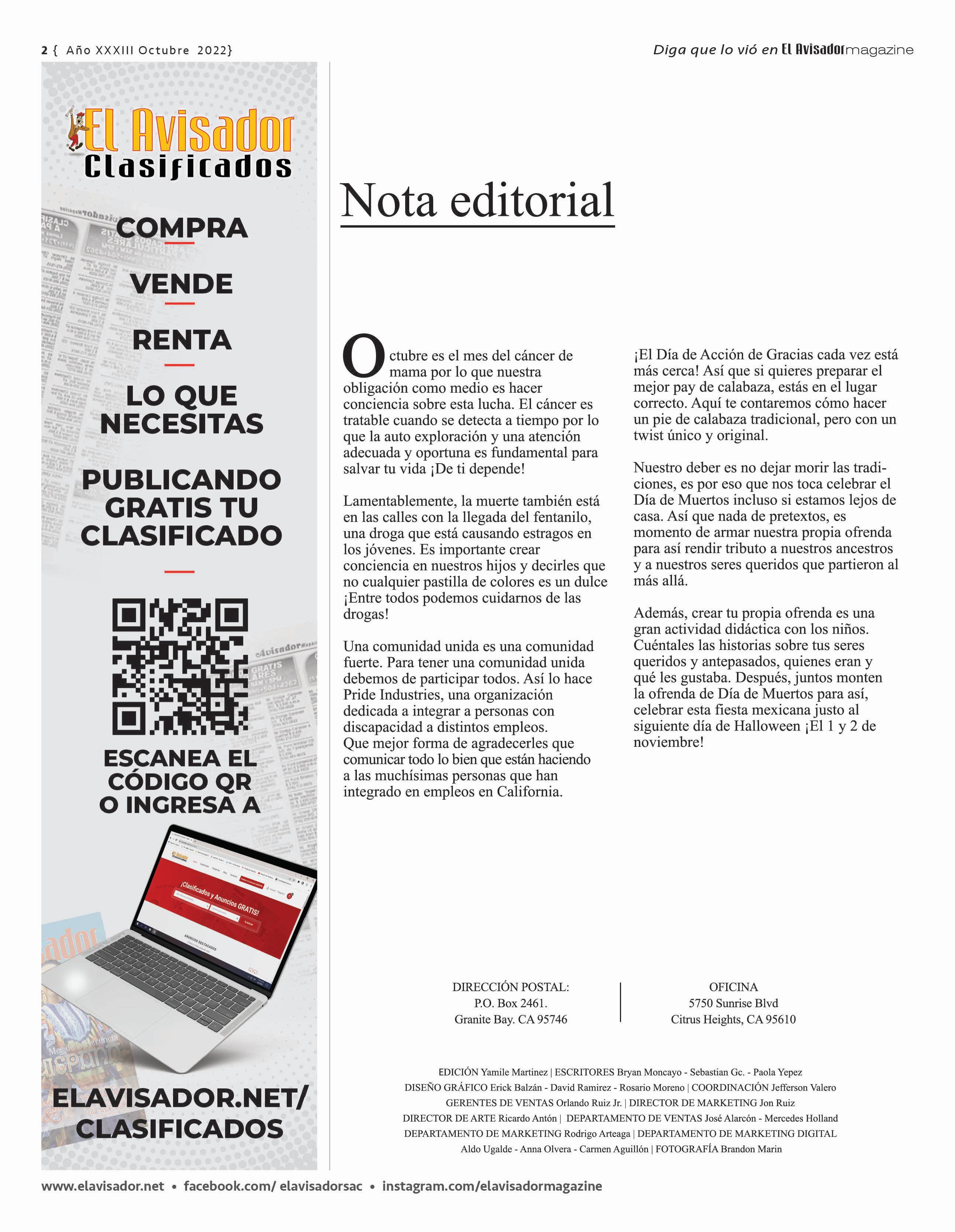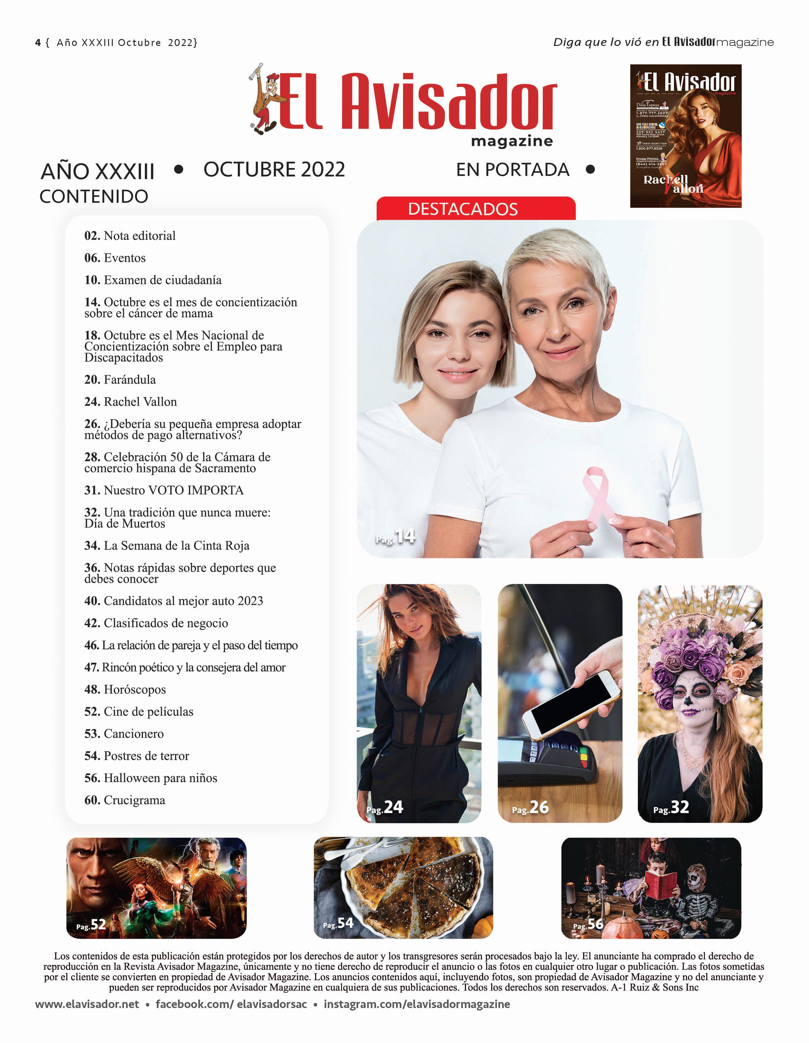 El Avisador Magazine. ¡Edición octubre 2022! - Todos lo que debes saber sobre el examen de ciudadanía - No puedes perderte lo último de la Farándula - Y este mes tenemos a la hermosísima Rachel VallonCeremonia del grito de independencia - 5 mitos sobre el cáncer de mama - Lo que necesitas saber sobre las mamografías - Día de lmuertos, una tradiciín que nunca muere - Nuestro voto importa, latinos registrados para votar - La semana de la cinta roja - Y encuentra los mejores Clasificados de todo el mercado ¡Somos el avisador magazine, siempre con lo mejor! Estamos en más de 5,000 puntos de distribución en el norte de California. www.elavisador.net