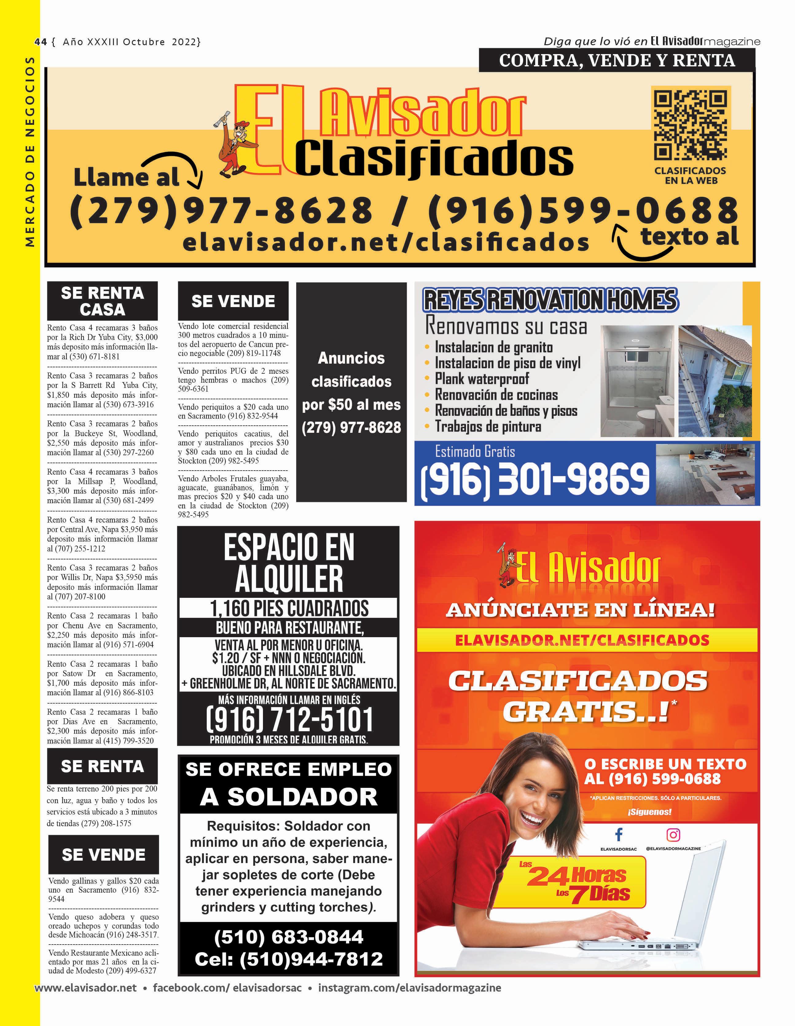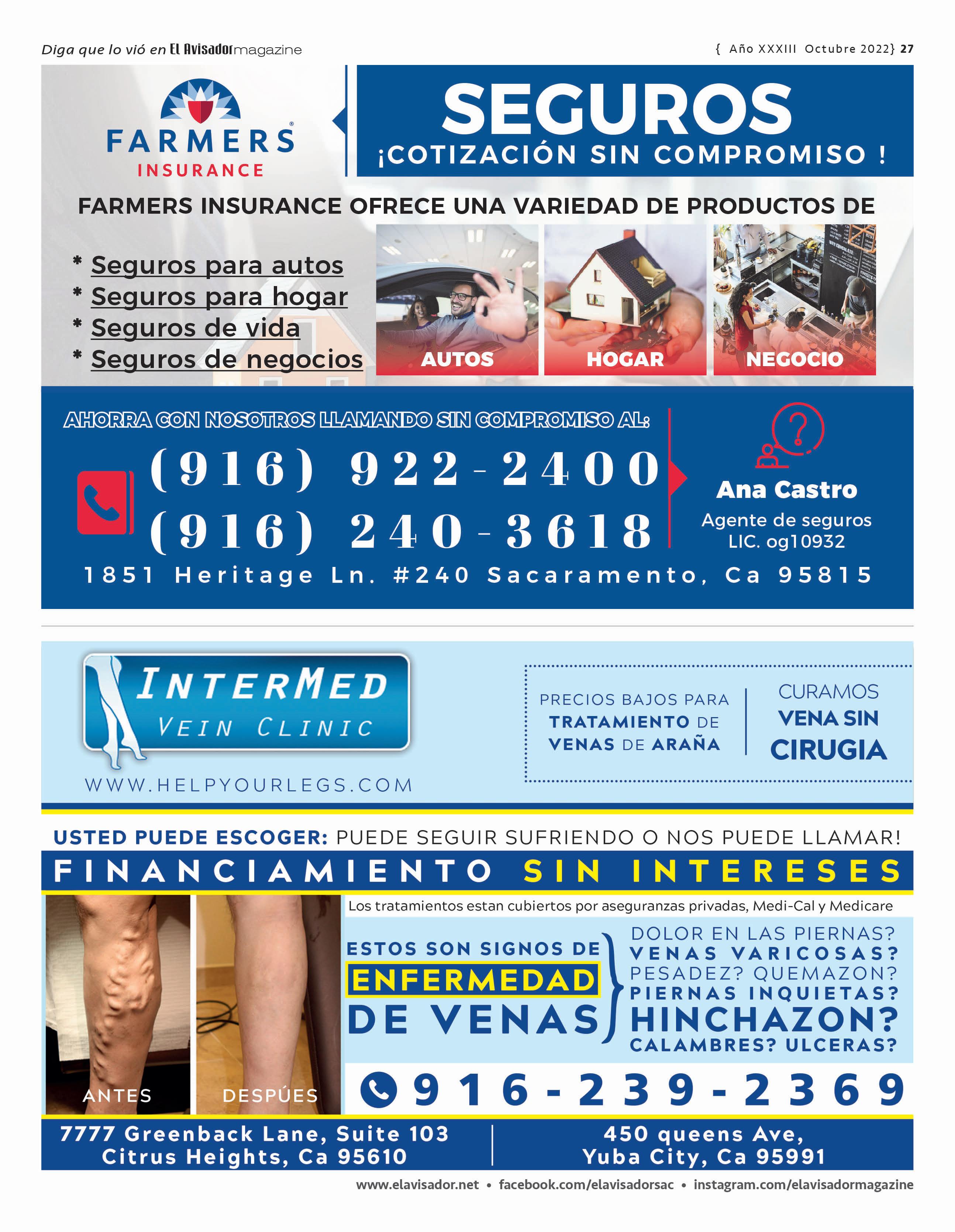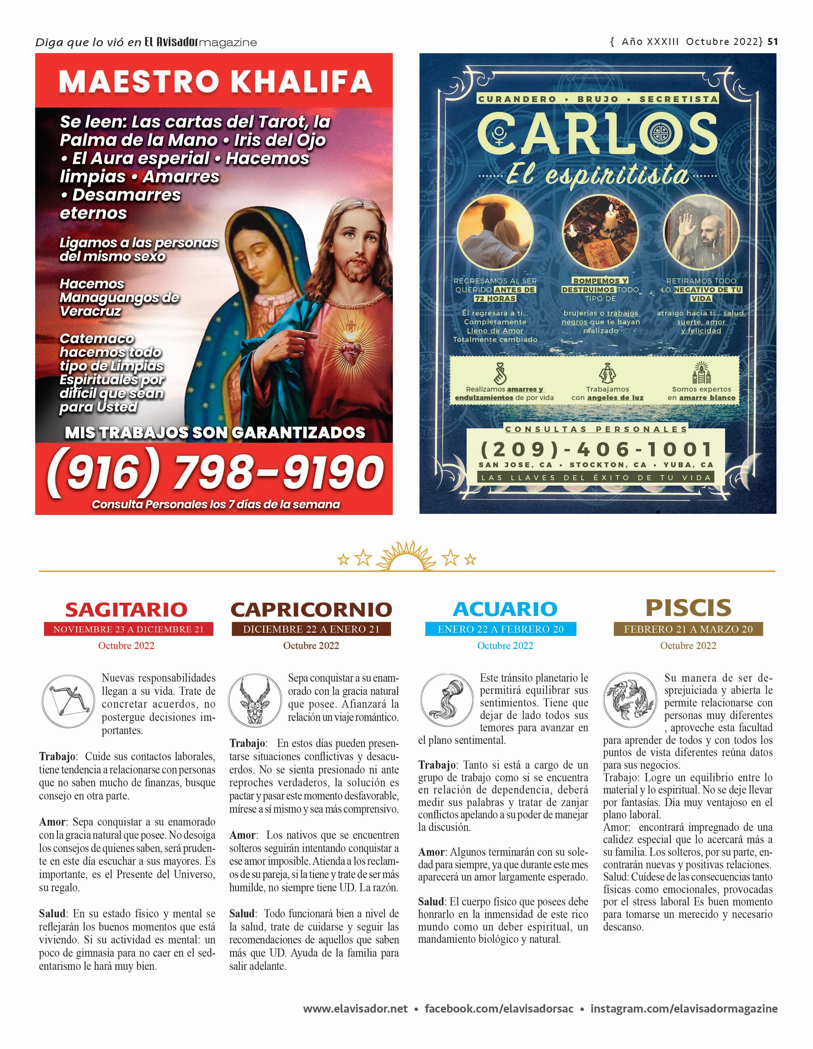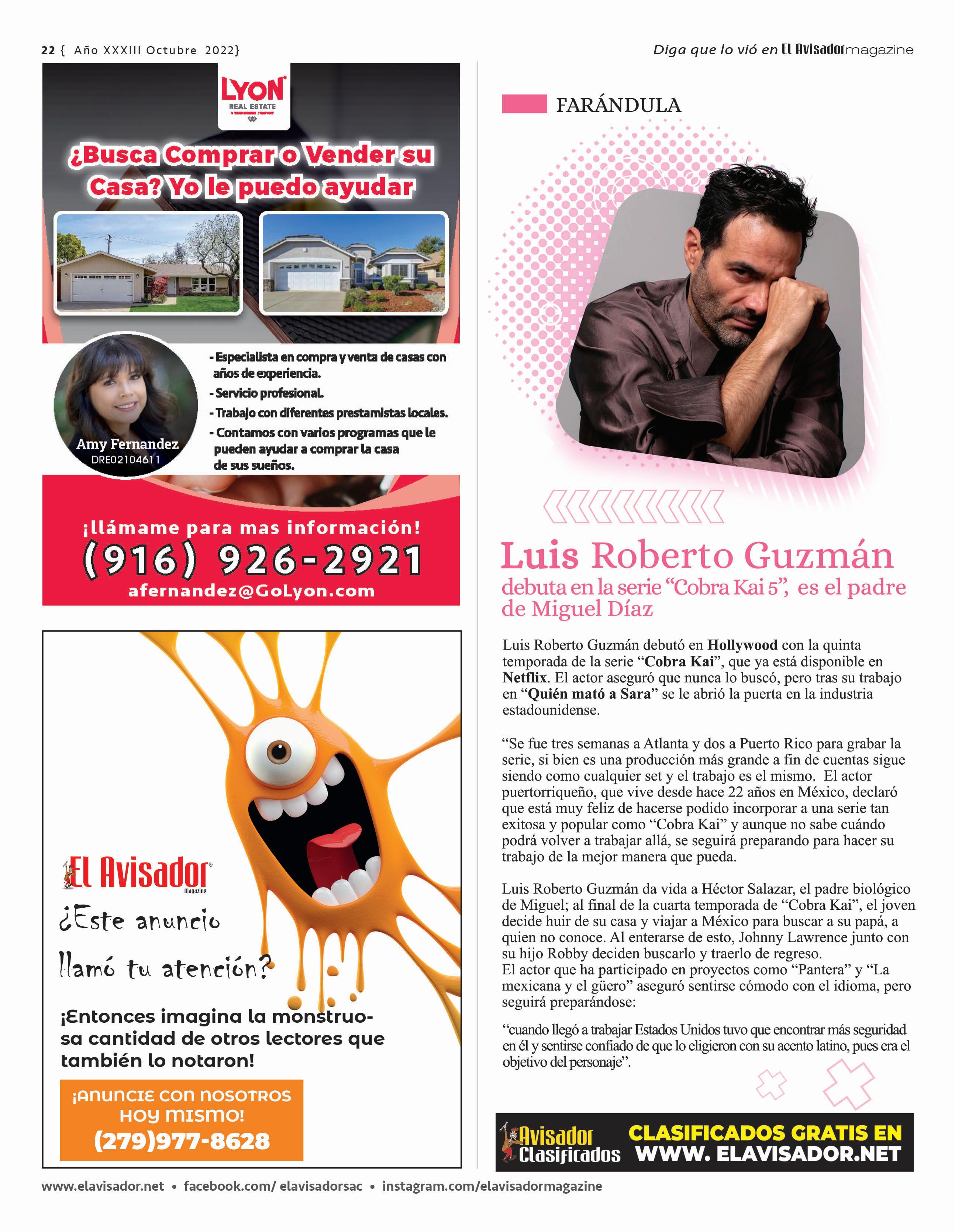 El Avisador Magazine. ¡Edición octubre 2022! - Todos lo que debes saber sobre el examen de ciudadanía - No puedes perderte lo último de la Farándula - Y este mes tenemos a la hermosísima Rachel VallonCeremonia del grito de independencia - 5 mitos sobre el cáncer de mama - Lo que necesitas saber sobre las mamografías - Día de lmuertos, una tradiciín que nunca muere - Nuestro voto importa, latinos registrados para votar - La semana de la cinta roja - Y encuentra los mejores Clasificados de todo el mercado ¡Somos el avisador magazine, siempre con lo mejor! Estamos en más de 5,000 puntos de distribución en el norte de California. www.elavisador.net