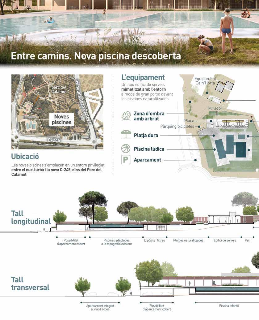 Por otro lado, la nueva piscina pública descubierta. Ya tenemos la propuesta, y ahora toca trabajar intensamente para que sea realidad en 2027. Sí, hace falta tiempo porque es un proyecto importante, pero la espera valdrá la pena. Estará ubicada al lado de la masía de Ca n’Horta y junto a la C-245, y plenamente integrada en el parque del Calamot. Muy cerca del casco urbano, lo que permitirá llegar a pie, pero también en transporte público, en bici y en vehículo privado, ya que contará con zonas de aparcamiento. Los vecinos y vecinas de Gavà tendremos tres piscinas diferenciadas: lúdica, deportiva y para los más pequeños. Estoy convencida de que será una instalación de primera. Os invito a conocer los detalles en estas mismas páginas.