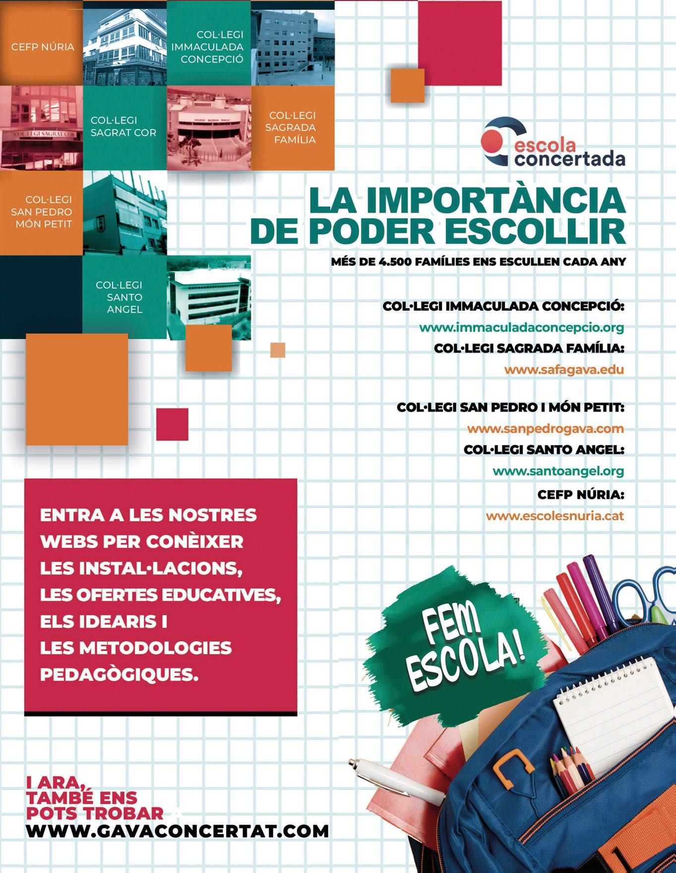 • La educación. El curso escolar ya ha comenzado, desde la educación infantil y la de adultos, hasta la primaria, la secundaria y la formación profesional. Lo ha hecho con normalidad, con el respaldo de becas escolares municipales, con mejoras en las instalaciones de las escuelas y, sobre todo, con el gran valor de siempre: la implicación, el esfuerzo y la capacidad de toda la comunidad educativa de Gavà, desde el profesorado hasta las familias.