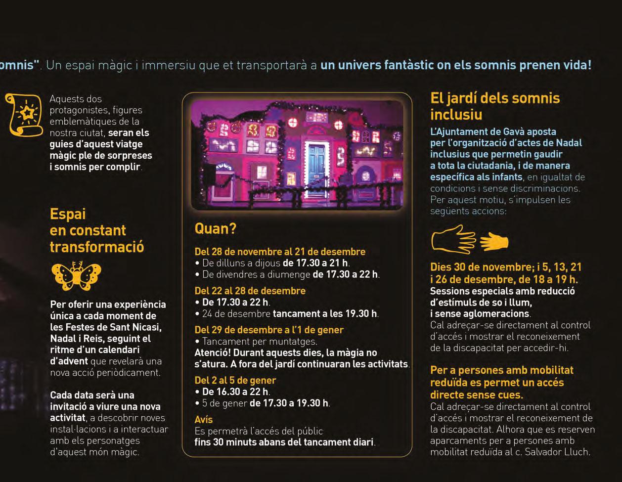 omiar. Imaginar. Mirar endavant. Fer realitat els desitjos. Compartir. Participar. Tots aquests verbs, totes aquestes situacions, conjuguen molt bé a Gavà. I a Nadal, un temps ben especial, encara més. Un temps que a la nostra ciutat té un recorregut llarg i intens. El vam iniciar omplint la Torre Lluc per encendre els llums i il·luminar els carrers (1.400 punts de llum repartits per tots els barris). Li donem continuïtat amb Sant Nicasi, la nostra festa major d’hivern. Passem per una munió d’activitats fins a final d’any i per la festa de rebuda al 2026. I conclourem amb el moment més esperat, l’arribada dels Reis, i el preàmbul meravellós del campament dels carters reials, aquesta vegada més ampli i renovat. Tota una història, un conte on la màgia i la il·lusió es converteixen en el denominador comú. I que enguany estrena un nou espai, el Jardí dels Somnis. El Jardí dels Somnis és la nova gran proposta per a les festes de Nadal a Gavà, que evolucionen així cap a una visió més dinàmica, amb nombroses activitats i