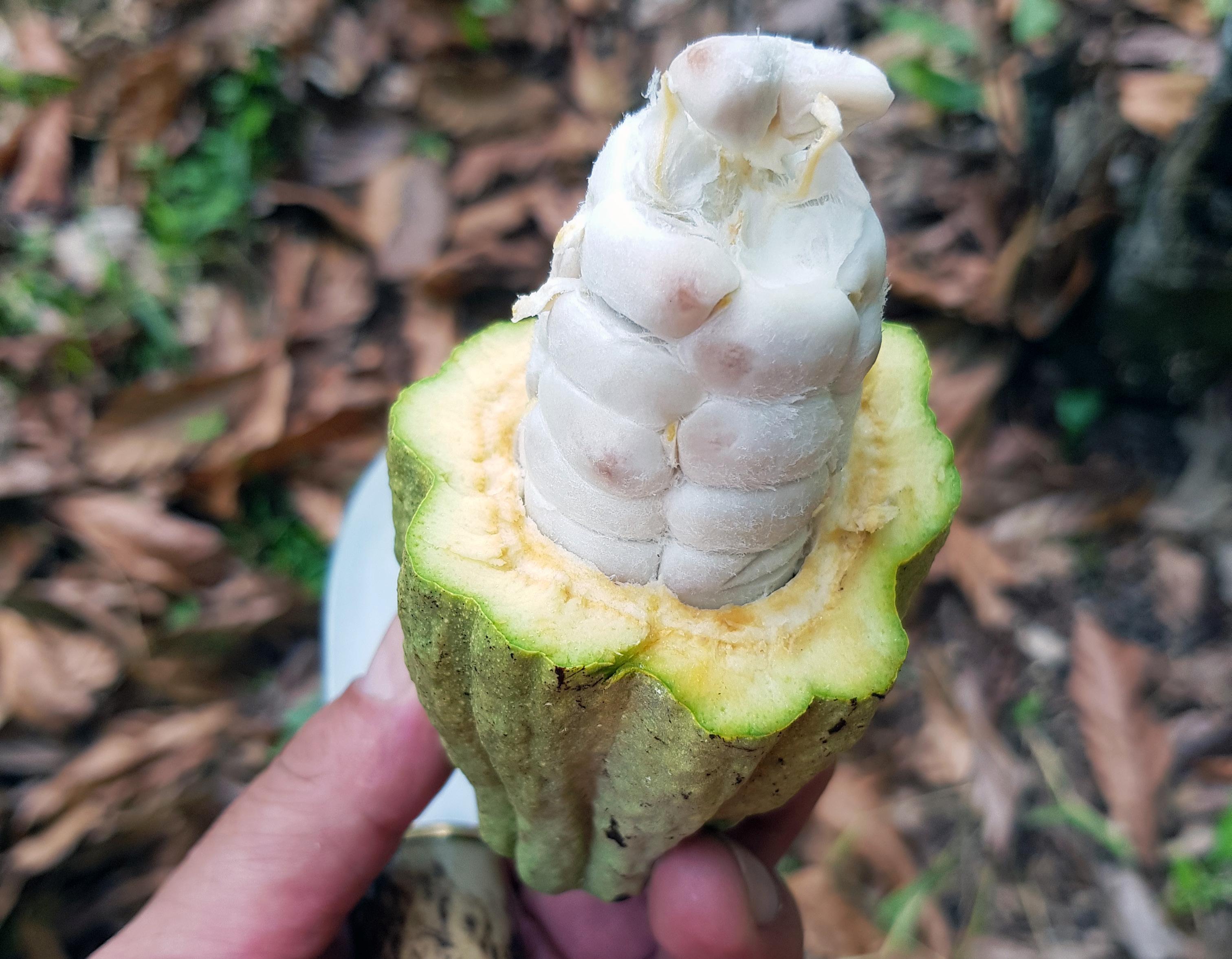1. Fruto del cacao abierto, se aprecian las semillas cubiertas por una carne blanca que se llama “baba blanca”.