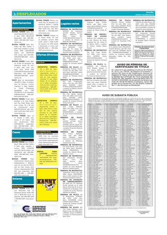 Legales varios PERDIDA DE MATRICULA 4653481 de automóvil privado Honda Accord, placa A505174, año 2004, chasis No. JHMCM56824C022077, a nombre de Daurys K. Mercedes González. PERDIDA DE MATRICULA De la motocicleta Honda, placa N045429, color gris, año 79, chasis No. C700140833, a nombre de Nicolás Ventura Paulino. PERDIDA DE MATRICULA: Automóvil Privado Toyota, año 2006, color azul , placa A492176, Chasis 4DBK36B76U074008 a nombre de Cornelio Santos Santos PERDIDA DE PLACA Del Automóvil Privado Toyota Corolla CE, año 1990, color gris, placa A317525, chasis 1NXAE94A2LZ078382, a nombre de Onésimo Pérez Pérez. PERDIDA DE MATRICULA Del Veh. Volkswagen Jetta, color gris, año 2002, placa A053432, chasis 3VWRV49MX2M153603, a nombre de Rebeca Aurora García Vilalta. PERDIDA DE MATRICULA Del Veh. Skoda, modelo GLX, año 1998, color verde, placa A217491, chasis TMBEEA654V0628023, a nombre de Claudia Patricia Romero Romero. PERDIDA DE PLACA Del Veh. Carga Daihatsu Hijet, año 2000, color rojo, placa L211983, chasis S200P0005485, a nombre de Juan Carlos Encarnación Colón. PERDIDA DE PLACA No. I039249, del autobús privado marca International, color amarillo, año 87, chasis No. No.1HVLPHYN1HH503194, a nombre Francisco Rosario y de la Cruz. PERDIDA DE PLACA Del Volteo Daihatsu, color azul, año 2008, placa S015205, chasis JDA00V11800078997, a nombre de Malespin Constructora, S.A. PERDIDA DE MATRICULA Del Jeep Nissan, color azul, año 2000, placa G072441, chasis PR50016072, a nombre de Andrés Moises Angeles Lovera. PERDIDA DE MATRICULA Del Automóvil Privado Honda Civic, año 1992, marrón, placa A214587, chasis 1HGEG8657NL051747, a nombre de Juan Alejandro Marion-Landais Gómez. PERDIDA DE MATRICULA: Camioneta Toyota roja, año 1983, chasis LN40128983, placa Lv215 nombre de Ana Dolores Rodríguez Cabrera PERDIDA DE CONTRATO DE ARRENDAMIENTO Del Solar No. 03, manzana No.89, ubicado en la calle Héctor René Gil No.10, de la Ciudad De La Romana, R.D. a nombre de la Sra. Ramona Sánchez de Amparo. PERDIDA DE PLACA De la Motocicleta JINHAO, año 2005, color rojo, placa N125808M, chasis LGNPCJLX557190375, a nombre de Cristian Osvaldo Cuello Toribio. PERDIDA DE PLACA Del Veh. Carga Daihatsu, color blanco y rojo, año 1999, placa L086129, chasis V11908041, a nombre de Pasteurizadora Rica, CXA.