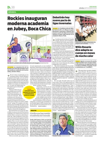té en la organización, es una realidad”, dijo Pérez, quien fuera el primer jugador quisqueyano en vestir la camiseta de los Rockies en 1996. “Ahora los jugadores tendrán una mejor vida en su preparación, contrario a cuando tenía que tomar El acto estuvo encabezado por los rodados en Sabana Perdida”, agregó. Las hermanos Dick y Charlie Monfort, modernas instalaciones cuentan con dos propietarios del equipo, así como de Ro- campos y medio de juegos y tiene una calando Fernández, director senior de ope- pacidad para 80 jugadores. Posee, aderaciones internacionales de los Rockies, más, oficinas administrativas, salón de quienes se refirieron a la importancia de clases, sala de entrenamientos, comedor, establecer en el país, al considerarlo co- cocina industrial, dormitorios para jugadores, coaches y tryouts. mo “el centro de béisbol para LaAsimismo, cuenta con un tinoamérica para el desarrollo amplio clubhouse, gimnasio, de peloteros”. Terreno sala de reunión, edificio de “Estamos felices de poEn 68,000 metros mantenimiento, lavandeder establecernos en la República Dominicana”, ex- cuadrados fue construida rías y depósito de equipos la academia de los deportivos, la cual operará presó Dick, presidente ejeRockies de Colorado. con los más altos estándacutivo de Colorado. “Esta res de calidad, a juicio de los academia será de gran imejecutivos de los Rockies, franportancia y servirá de plataforquicia fundada en 1991 en Denver, ma para la formación de nuevos talentos para el futuro de nuestra organi- Colorado, y comenzó sus actividades en zación”, agregó. El complejo está equi- las Grandes Ligas en 1993, al mismo tiempado de una tecnología de punta, lo que po que iniciaron sus operaciones en Lapermitirá al equipo ser más eficientes en tinoamérica. l JULIO E. CASTRO C. sus operaciones de búsqueda de nuevos talentos y desarrollo de jugadores. El levantamiento de la obra fue desaREGISTRO rrollado en una porción de 68 mil metros cuadrados. Su construcción se inició en abril de 2012 y concluyó en abril del presente año. “Esta academia no solo servirá para la formación de jugadores de béisbol, sino para hombres del bien para el Desde 1996 hasta el 2012, un total de mañana. Esa es una de nuestra misión y 17 peloteros dominicanos han llegado del compromiso que tienen los Rockies a las Grandes Ligas con los Rockies, con la sociedad”, expuso Dick. Entre los entre ellos Neifi Pérez, Lariel Gonzápeloteros del conjunto de la División Oes- lez, Elvis Peña, Juan Uribe, Jorge Sote de la Liga Nacional estuvieron presen- sa, Jorge de Paula, Juan Morillo, Ubtes en el acto de apertura el receptor Wi- aldo Jiménez (quien en 2010 tiró el prilín Rosario; el paracorto Jonathan Herre- mer no-hitter en la historia del equira, y los lanzadores Juan Nicasio y Jhoulys po), Alberto Arias, Pedro Strop, Esmil Chacin, así como los exjugadores Neifi Rogers, Samuel Deduno, Juan Nicasio, Pérez, Pedro Julio Astacio y Elvis Peña. Aneurys Rodríguez, Wilín Rosario, “Este es un sueño, que aunque no es- Héctor Gómez y Edward Cabrera. La organización de los Rockies de Colorado inauguró ayer una moderna academia en el sector Jubey, de Boca Chica. ACTIVIDAD.