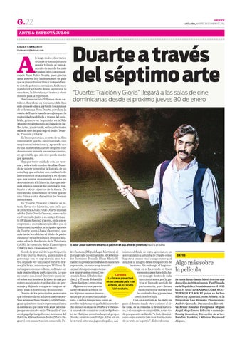 dro Santana (Miguel Ángel Martínez) al- mismo, al final, se logra apreciar en un go exagerado y contrastante; el Goberna- acercamiento a la tumba de Duarte cómo dor Jerónimo Borgella (Juan María Al- hay otras cruces en el campo santo y, al monte) su presencia resultaba en ocasiones ampliar la imagen éstas desaparecen de la escena. Sin embargo, el largomeimponente, en otras muy dramátitraje en sí ha venido en buen ca; y así otros personajes no memomento, pues hace falta hanos importantes como ConCartelera cer resurgir dentro de cada cepción Bona (Cibeles SánLa cinta se proyectará uno cierto amor por la pachez) y Tomás Bobadilla (Jorge Santiago), entre otros. en los cines del país y del tria, el llamado sentido de exterior, en el Circuito pertenencia, para de ese Algunos errores parecen Universitario. modo encontrar razones por haber escapado al editor, colas cuales luchar y preservar mo algunas escenas innecenuestra soberanía. sarias que poco aportan a la hisCon esta entrega se ha dado un toria, o saltos temporales como se percibe en la toma en que habiéndose he- paso al frente, dando otro carácter al cicho público el exilio de Duarte a Venezue- ne local, de la comedia al drama histórila acusado de conspirar contra el gobier- co, y el concepto es muy válido, sobre tono de Haití, se muestra luego al propio do porque está dedicado “a todo dominiDuarte reunido con Felipe Alfau en un cano cuyo corazón late más fuerte cuanárea rural ante una jugada de gallos. Asi- do se trata de la patria”. Enhorabuena. l