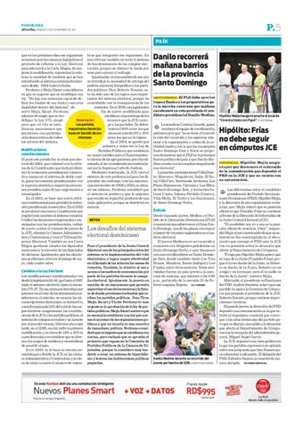 PAÍS que en los próximos días ese organismo bros que integraría ese organismo. En someterá ante las cámaras legislativas el esa reforma también se varió el sistema proyecto de reforma a la Ley Electoral de funcionamiento de los colegios elecpara adecuarla a la Carta Magna, de aco- torales, porque se eliminó la tanda por gerse la modificación, superarían la vein- sexo para ejercer el sufragio. Igualmente, en los cambios de ese año tena la cantidad de cambios que se han introducido al sistema comicial domini- se introdujo la necesidad de entrega del padrón electoral fotográfico a los particano desde 1994 hasta la fecha. Perdomo y Mejía Ricart coincidieron dos políticos. Para Roberto Rosario, esen que es urgente que se modifique esa te ha sido uno de los logros más imporley. “No hay una instancia capaz de de- tantes del sistema electoral, porque ha finir los límites de esa Junta y eso crea contribuido con la transparencia de los comicios. En el 2005, esa legislación ilegalidad dentro del sistema”, obfue de nuevo modificada para servó Mejía Ricart. Perdomo, establecer el porcentaje de los además de exigir que se moObservación recursos que la JCE entredifique la Ley 275, abogó Los partidos ga a los partidos. Se distripara que en ella se estamayoritarios hacen las buiría el 80% entre los que blezcan mecanismos que leyes en función de sus alcancen más del 5% y 20% garanticen una participaintereses entre los que no lo logren. ción democrática de todos En el 2004, se aprobó por los actores del sistema. primera y única vez la Ley de Modificaciones Partidos Políticos, que establecía constitucionales un marco jurídico para el funcionamienEl punto de partida fue la crisis pos elec- to interno de las agrupaciones, pero fue elitoral del 1994, que culminó con la refor- minada, al ser considerada inconstitucioma de la Constitución que incluyó elimi- nal por la Suprema Corte de Justicia. Mediante resolución, la JCE creó el nar la reelección presidencial consecutiva, instaurar el sistema de doble vuel- sistema de voto preferencial para los dita, ganar los comicios presidenciales con putados, sin embargo, tras las experienla mayoría absoluta y separó las eleccio- cias electorales de 2006 y 2010, se elimines presidenciales de las congresuales y nó ese sistema. Perdomo consideró que el sistema es positivo y que lo negativo municipales. En el 2002, se hace una nueva refor- que resultó en el país fue producto de una ma constitucional para permitir la reelec- mala aplicación, porque se desvirtuó su ción presidencial consecutiva. En el 2010 esencia. l se proclamó una nueva Constitución que implicó seis cambios al sistema comicial. Unificó las elecciones congresuales y muRETOS nicipales con las presidenciales, redujo de nueve a cinco el número de jueces de la JCE, eliminó la Cámara Administrativa y Contenciosa, y creó el Tribunal Superior Electoral. También en esa Carta Magna quedaron creados los diputados Para el presidente de la Junta Central nacionales y la elección de los diputados Electoral uno de los principales retos del de ultramar. Igualmente, que las eleccio- sistema es la implementación del voto nes se efectúen el tercer domingo de ma- electrónico, y lograr mayor efectividad yo, cada cuatro años. en el llenado de las actas en las mesas de votación. También, lo relativo al uso y Cambios a la Ley Electoral acceso a los medios de comunicación por Los modificaciones constitucionales van parte de los partidos durante la campadesde la legislación 58-84, que hasta el 1997 ña electoral. Igualmente, la puesta en regía el sistema electoral, hasta la inicia- marcha de un mecanismo que permita tiva 275-97. En esa norma se introdujo por supervisar el uso de los recursos y la fuenprimera vez el voto de los dominicanos re- te de donde provienen los fondos que residentes en el exterior, se crearon las cir- ciben los partidos políticos. Para Tirso cunscripciones electorales, se instauró la Mejía Ricart y Tácito Perdomo lo más cuota femenina de 25% del total de los car- urgente es la aprobación de la ley de pargos electivos congresuales, las contribu- tidos políticos. Mejía Ricart sostuvo que ciones de la JCE a los partidos políticos, el es necesario establecer una ley que norsistema de colegios cerrados y un horario me el accionar de las organizaciones popor el sexo del votante. Sólo tres años más líticas y que no tenerla es una muestra tarde, en el 2000, esa ley sufre la primera de inmadurez política. Perdomo consimodificación, y se eleva de 25% a 33% la deró que es urgente que se establezca esa cuota femenina y se establece que se alter- norma, pero rechazó que se apruebe el nen los cargos de síndicos y vicesíndicos proyecto que reposa en la Comisión de de acuerdo al sexo. Partidos Políticos de la Cámara de DiEn el 2003, se le hace la tercera en- putados, porque la considera muy tenmienda para dividir la JCE en las cáma- dente a crear un sistema de bipartidisra Administrativa y Contenciosa y se ele- mo y lesiona las instituciones políticas va de cinco a nueve el número de miem- pequeñas.