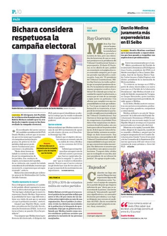 Bichara informó que Medina cuenta con El coordinador del sector externo más de mil 300 movimientos de apoyo del candidato presidencial del PLD, en todo el país y, de esos, en el Gran SanDanilo Medina, sostuvo que es necesa- to Domingo hay 700. Reiteró que el objetivo del secrio que en los meses que le quedan tor externo es sumarle más de a la campaña se incluya los proun millón de votos a Medina gramas de gobierno de los Respeto en los comicios del 20 de partidos, dado que es un eleBichara dijo que es mayo. mento fundamental para necesario que la campaña Informó que en los próxiconvencer a la población. siga el curso de respeto mos días entregará más de “Hasta ahora hemos saque ha tenido. 226 mil carnets a personas ludado la conducta exhibique fueron registradas duda por los simpatizantes de rante la campaña “1+ para Dalos partidos. Esa conducta de nilo” que se realizó en diciembre respeto, en la manera de lo posible, de no violencia, aún cuando ha habido pasado. Sostuvo que el sector externo coincidencia de actividades, tenemos que surgió desde hace más de tres años y direconocerlo, y esperamos que así segui- jo que la mayoría de los movimientos son espontáneos. l YANESSI ESPINAL rá siendo”, sostuvo. Bichara fue entrevistado por el director general de Multimedios del Caribe, Osvaldo Santana. MILITANCIA “Danilo representa lo nuevo”