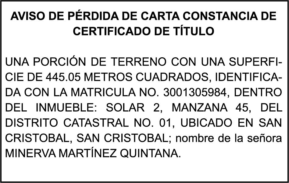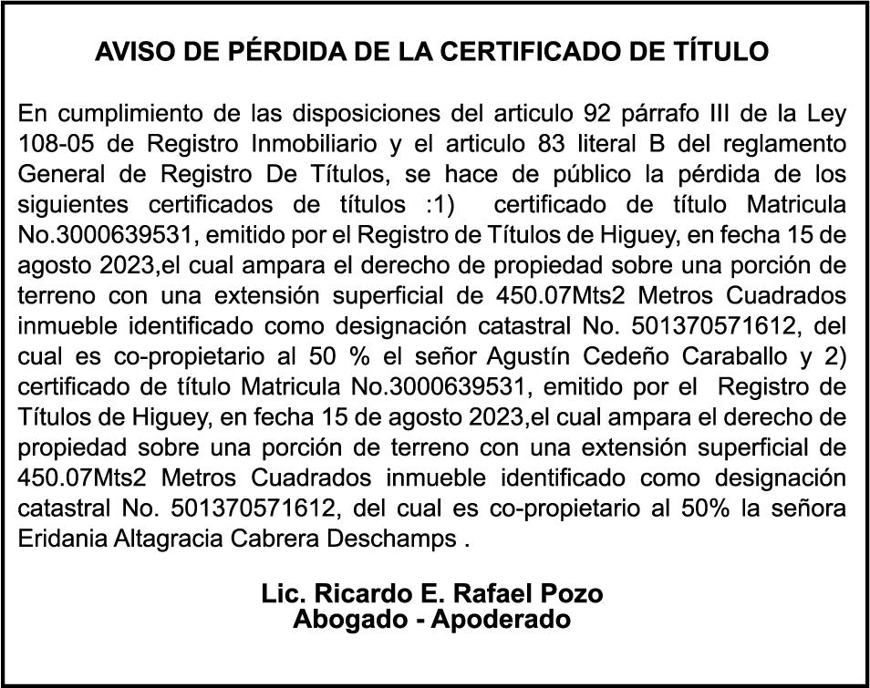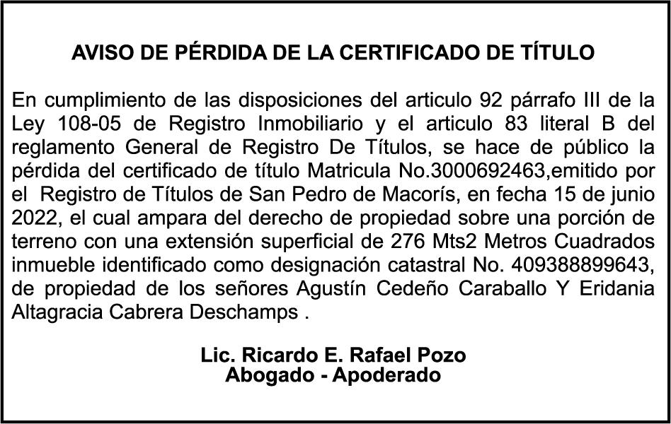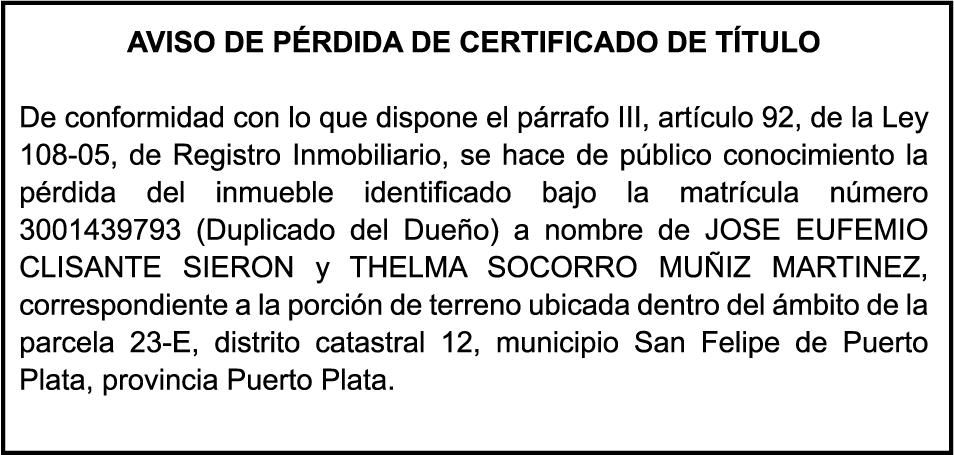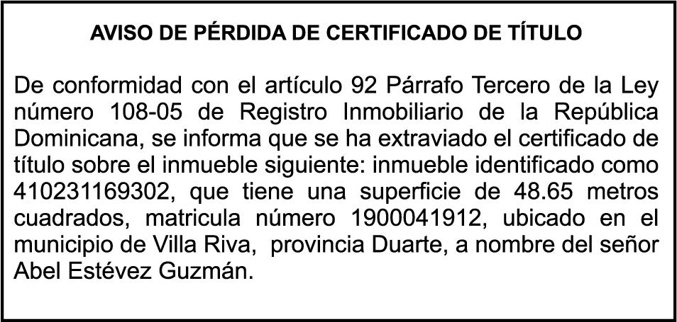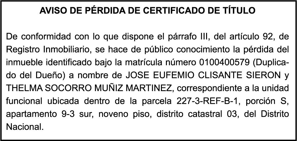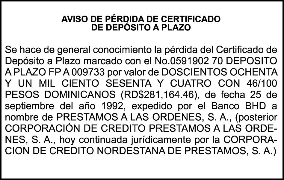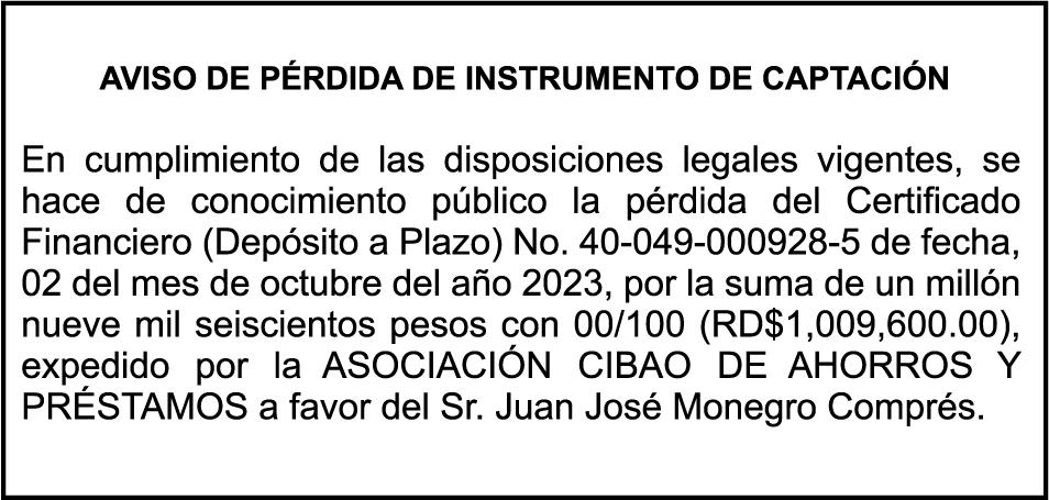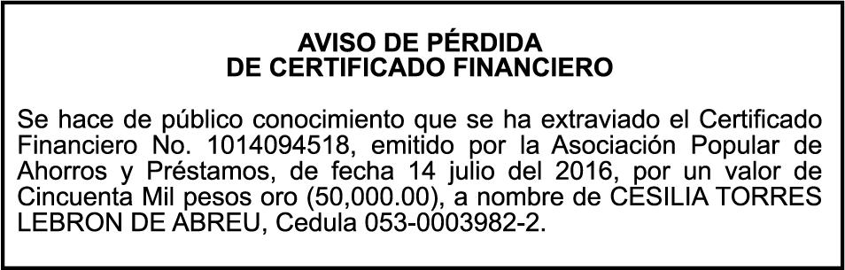 SE hace de público conocimiento la pérdida de certificado financiero No.41800061-2perteneciente al señor VICTOR MONTERO MONTERO, expedido por la cooperativa deahorros, créditos y servicios múltiple central, INC (coopcentrar) con el No. 35038 expedido en fecha 30/10/2020 por RD$ 150,000.00.1013