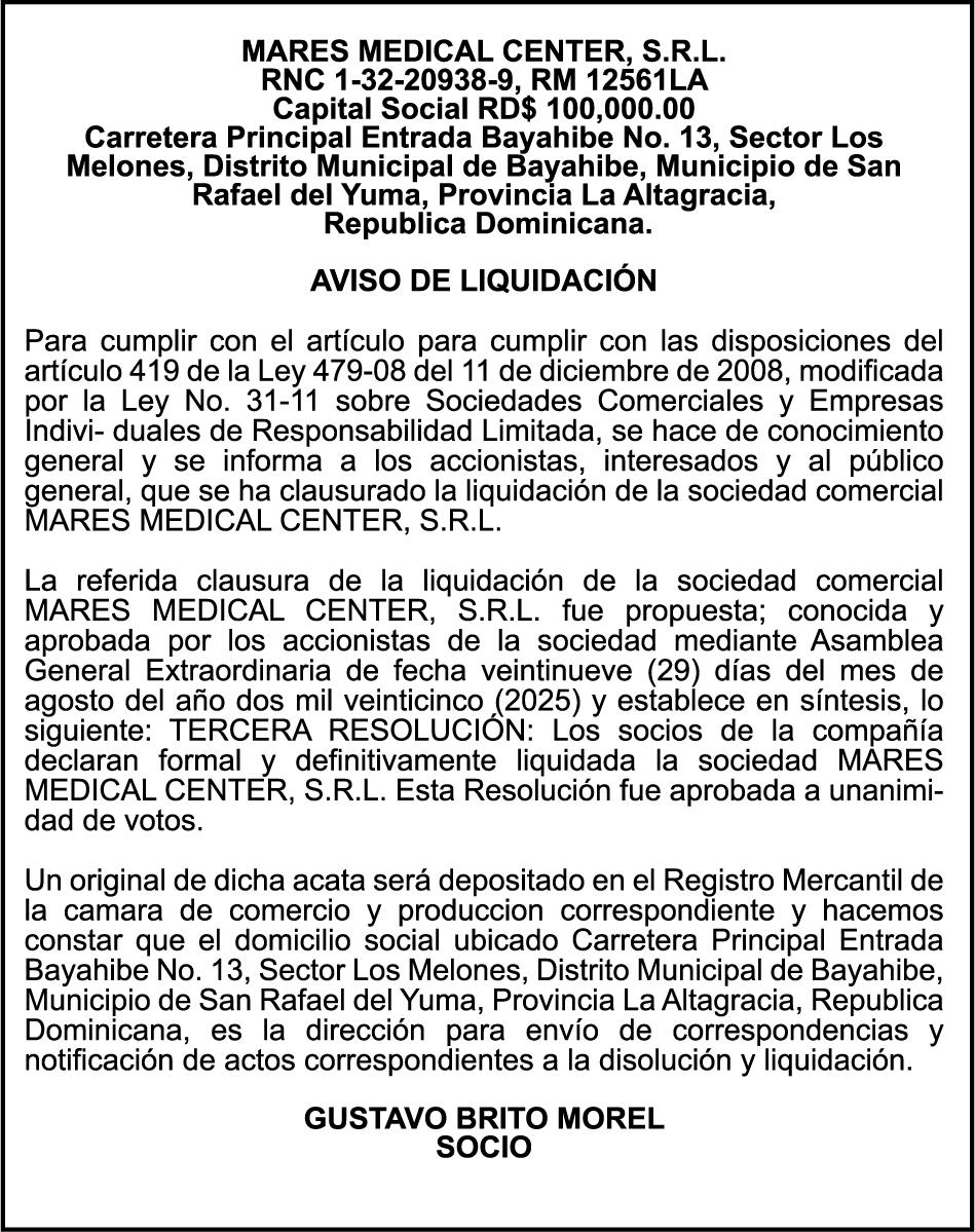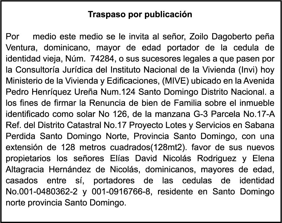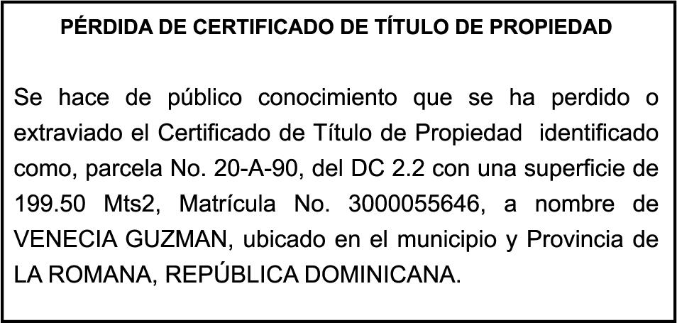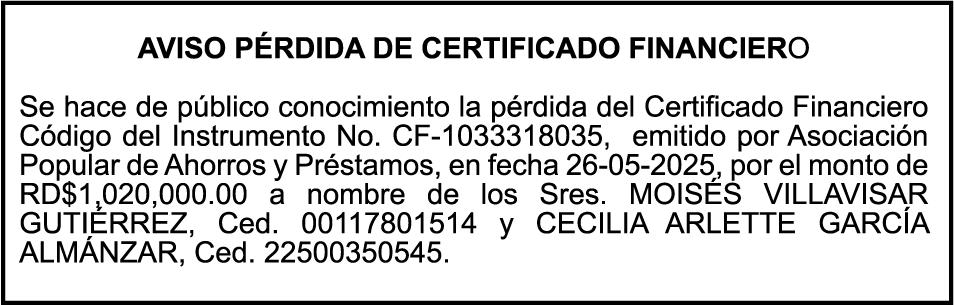 SE hace de público conocimiento la pérdida de certificado financiero No.41800061-2 perteneciente a la señora FLOR BETANIA VILORIO RIJO DE MONTERO, expedido por lacooperativa de ahorros, créditos y servicios múltiple central, INC (coopcentrar) con el No.35039 expedido en fecha 30/10/2020 por RD$ 450,000.00.