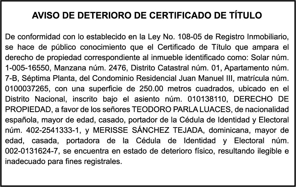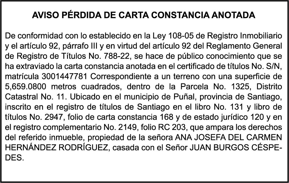 PERDIDA DE PLACA No. N015114, Motocicleta YAMAHA, Color rojo, Año 2000, Chasis 5Y4AH06Y81A000230, a nombre de CASIMIRO SERVANDO SANCHEZ FUENTE, Ced. 00112211453.