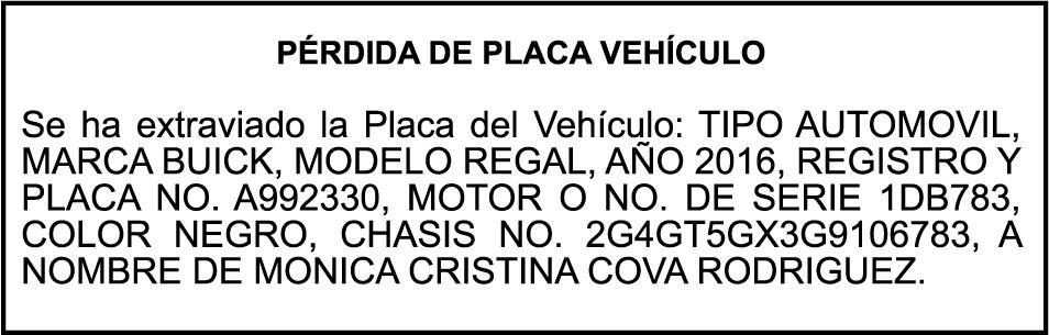 PERDIDA DE PLACA.NO.K1179300,Chasis GCLJCNLR4H0A22053,Marca GACELA,Modelo TEKEN 250,Color AZUL,Año 2017, a nombre de JORGE TEJADA POLANCO,Ced.031-0158477-8 PERDIDA DE PLACA AA82428,AUTOMOVIL PRIVADO KIA,AÑO 2020,COLOR GRIS,CHASIS 3KPF24AD6LE182229 A NOMBRE DE MIGUEL ANGEL DE JESUS CAMBERO