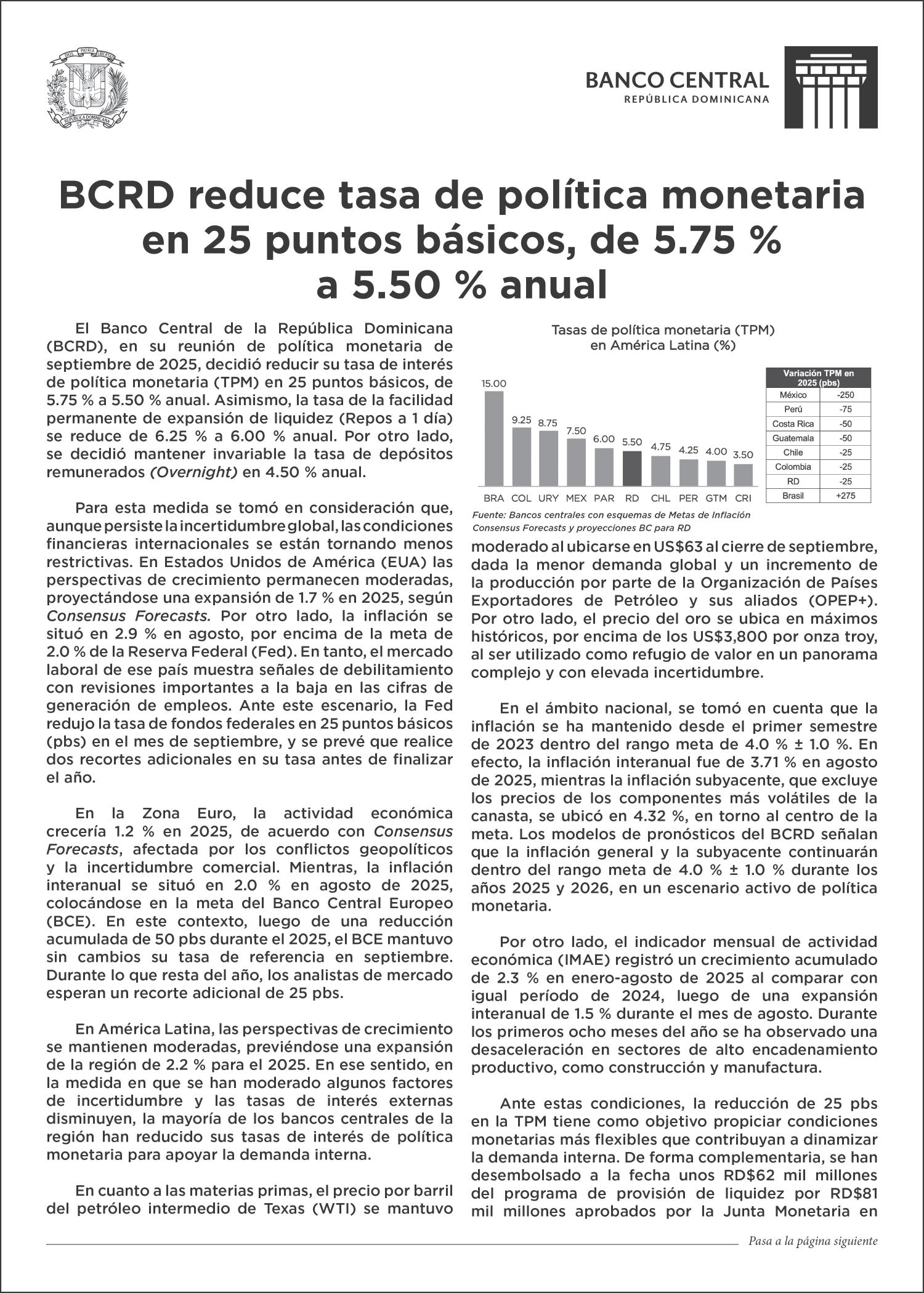 Decisión facilita crédito y apoya la inversión en busca de apuntalar el crecimiento al cierre del 2025. P.16