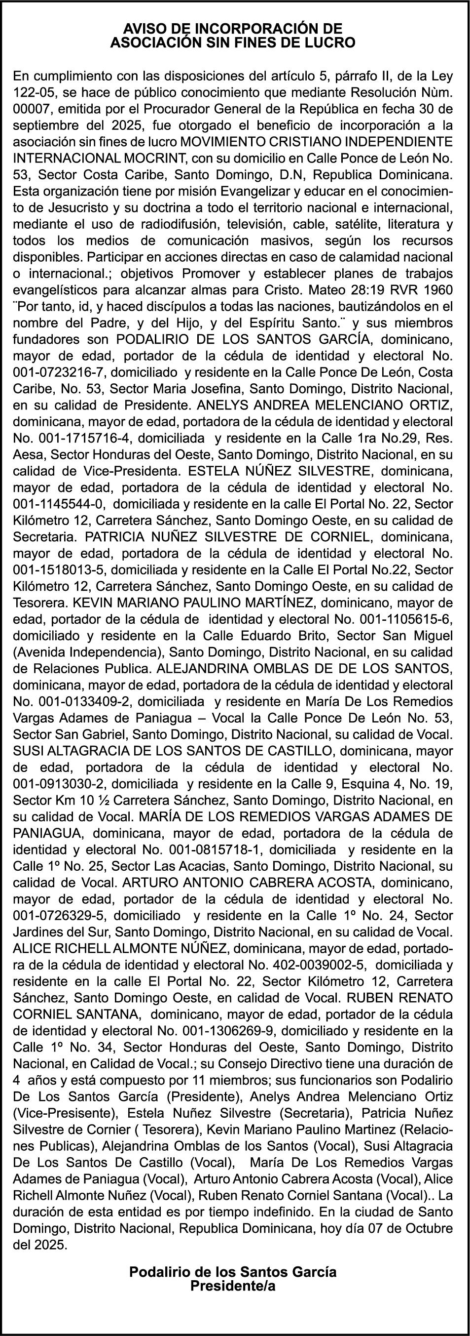 SE hace de público conocimiento la pérdida del Certificado Financiero número 844270975 emitido por Banco Popular Dominicano, S. A. Banco Múltiple, a nombre de MORFIS ALEXANDER PEREZ FELIPE, portador de la Cédula de Identidad y Electoral número 001-1543445-8, certificado número 844270975 expedido en 23 de septiembre de 2024 por el monto de (RD$600,000.00) más intereses generados a la fecha.