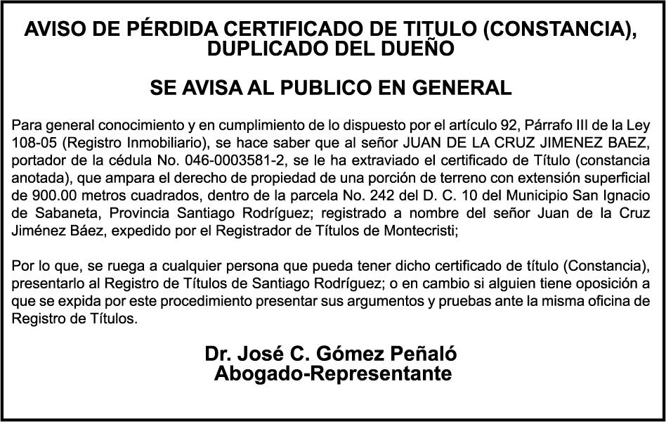 SE hace de público conocimiento la pérdida del Certificado Financiero número 842382210 emitido por Banco Popular Dominicano, S. A. Banco Múltiple, a nombre de ALIX JEAN, portador de la Cédula de Identidad y Electoral número 402-2481675-7, certificado número 842382210 expedido el 27 de junio de 2024 por el monto de (USD$6,193.33) más intereses generados a la fecha.