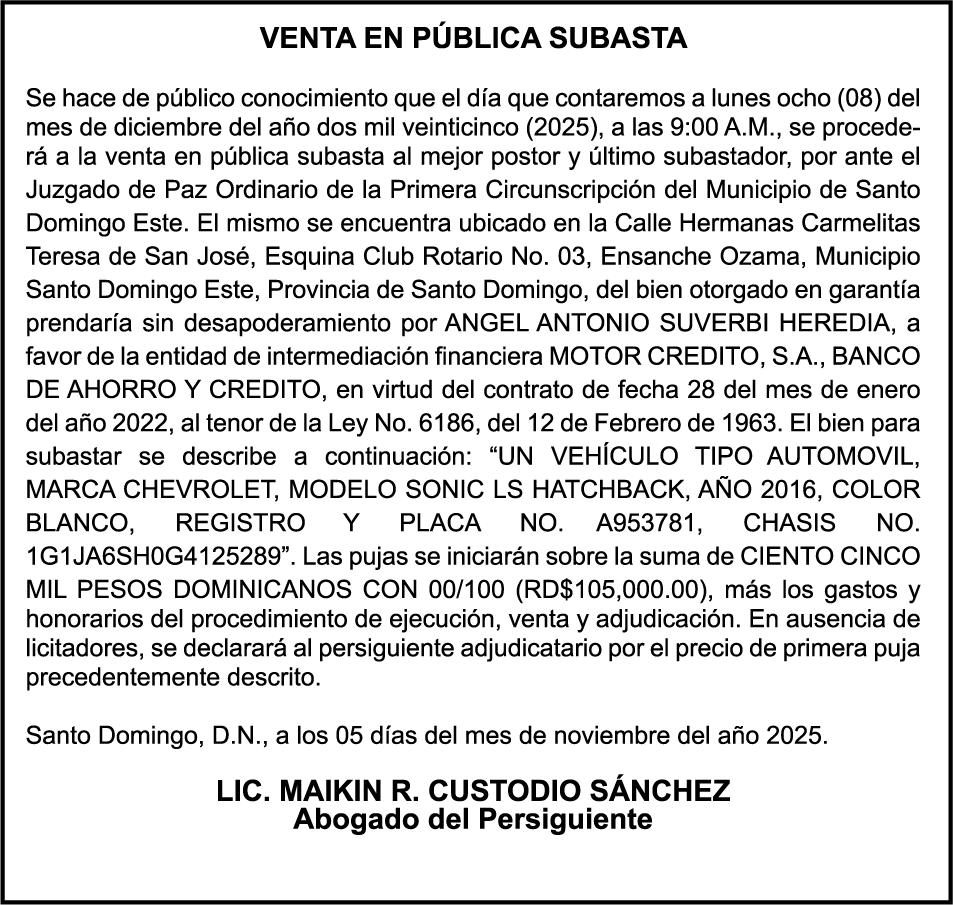 Automóvil Privado HONDA, modelo ACCORD, año 2004, color dorado, placa A458801, Chasis 1HGCM56304A007824, a nombre de NESTOR JUNIOR RIVERA PEGUERO.