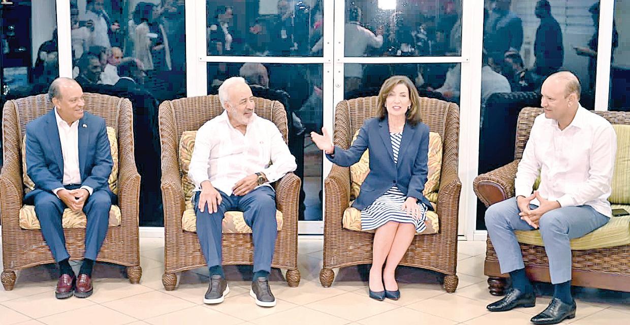 Los empresarios José Clase y Félix García, Kathy Hochul, gobernadora de Nueva York, y el alcalde de Santiago, Ulises Rodríguez, durante la bienvenida a la alta funcionaria por el Aeropuerto Internacional del Cibao en Santiago.