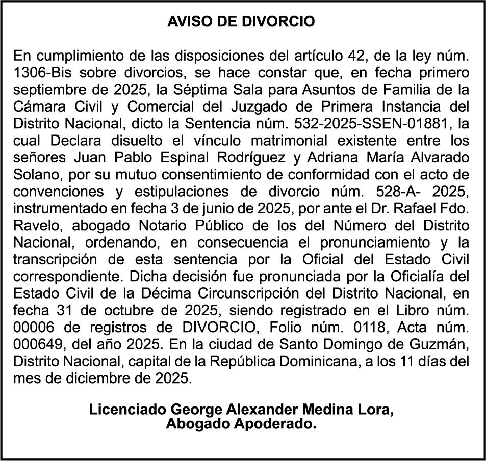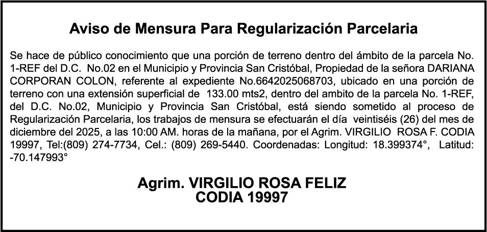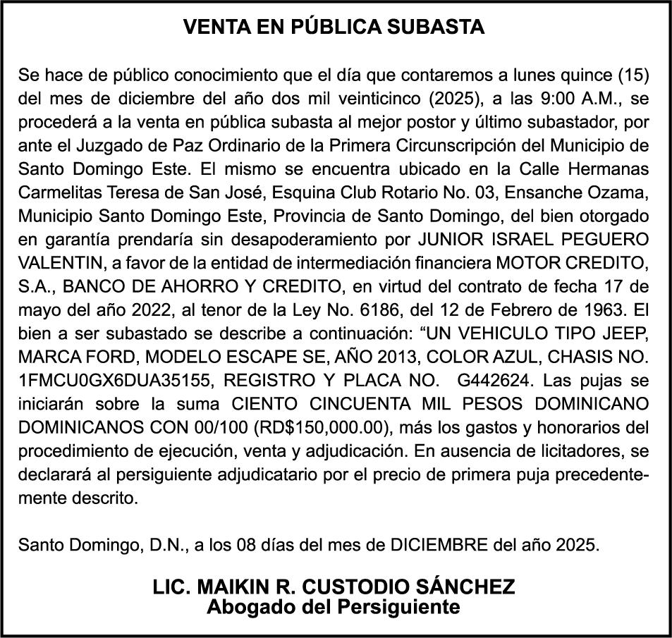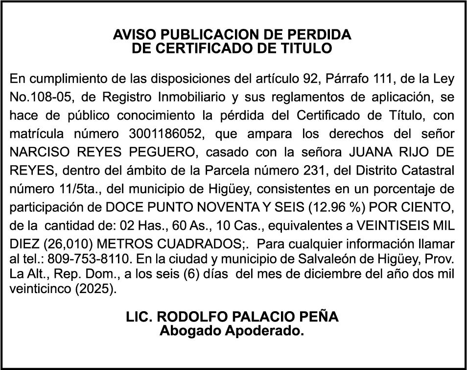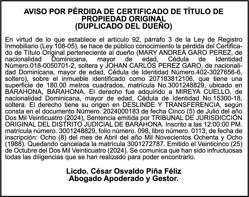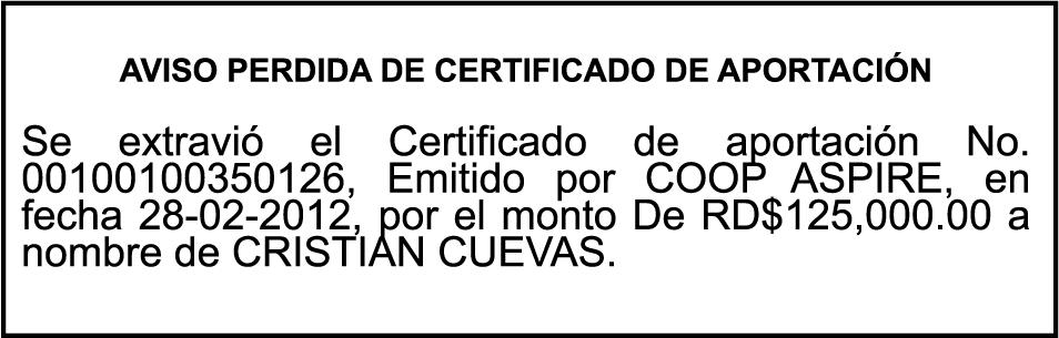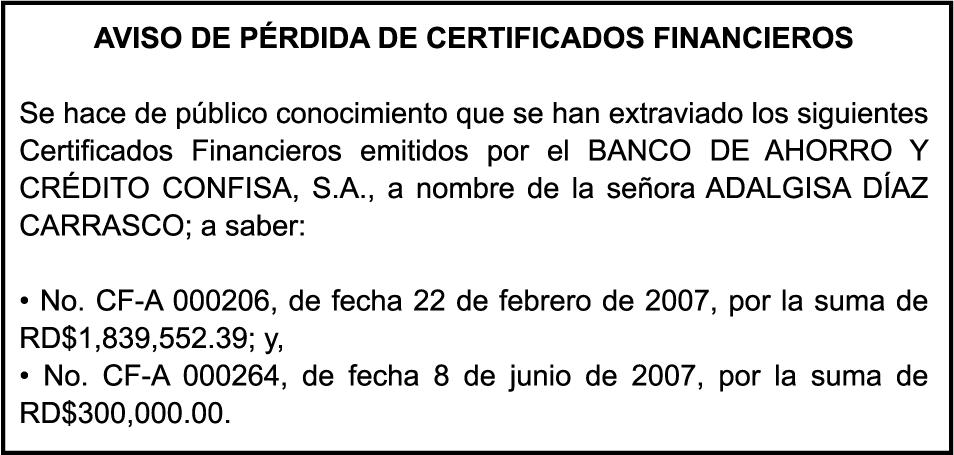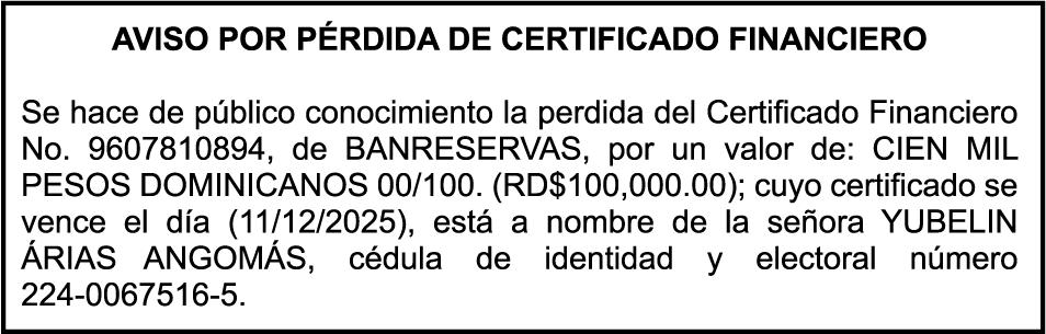 SE hace de público conocimiento la pérdida del Certificado Financiero número 842382210 emitido por Banco Popular Dominicano, S. A. Banco Múltiple, a nombre de ALIX JEAN, portador de la Cédula de Identidad y Electoral número 402-2481675-7, certificado número 842382210 expedido el 27 de junio de 2024 por el monto de (USD$6,193.33) más intereses generados a la fecha.