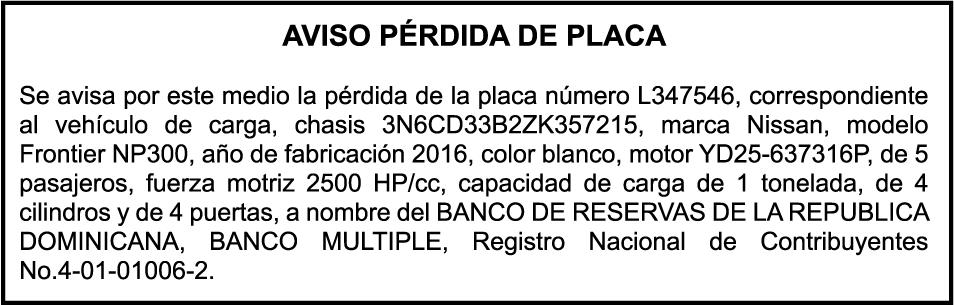 PERDIDA DE PLACA No. L273530, Veh. Carga MACK, modelo MRU613E, color blanco, año 2009, chasis 1M2AV07C80M004756, a nombre de CONTRATISTAS CIVILES Y MECANICOS, SA, RNC 101671815.
