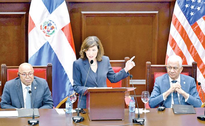 Antes del reconocimiento otorgado por ambas cámaras legislativas por su trayectoria política y defensa a la población dominicana, Courtney Hochul fue recibida por el presidente de la República, Luis Abinader, con quien firmó un acuerdo de intensión en nuevas áreas de cooperación en preparación ante desastres, innovación agrícola y desarrollo económico.