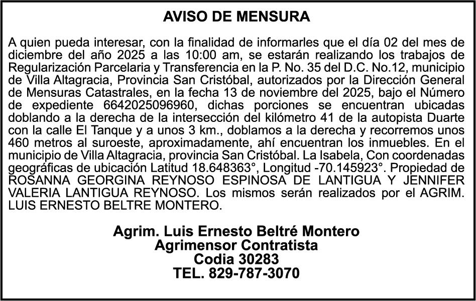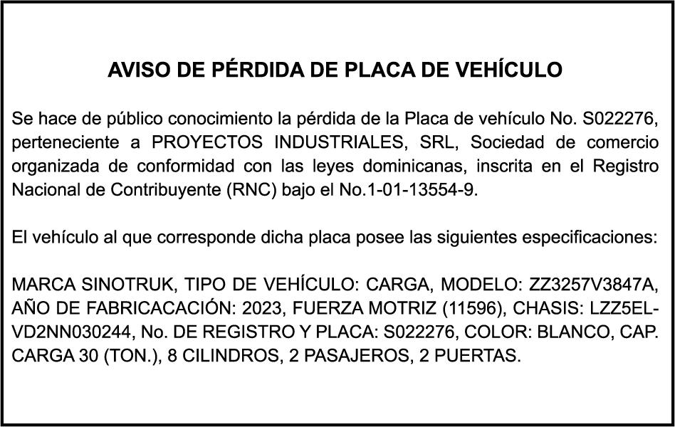 PERDIDA DE MATRICULA Veh. Carga FREIGTHLINER, modelo M2 106, Color verde, Año 2015, placa L530338, Chasis 3ALACXDT9FDGM4077, a nombre de VICTOR MANUEL RAMIREZ BELTRE. PERDIDA DE PLACA No. L522191, Veh. Carga CHEVROLET, mdoelo SILVERADO 1500 LT 4X4, color blanco, año 2020, chasis 3GCUYDET4LG263760, a nombre de EVELYN NAYALEN RODRIGUEZ ENCARNACION, Ced. 001-1835119-6.