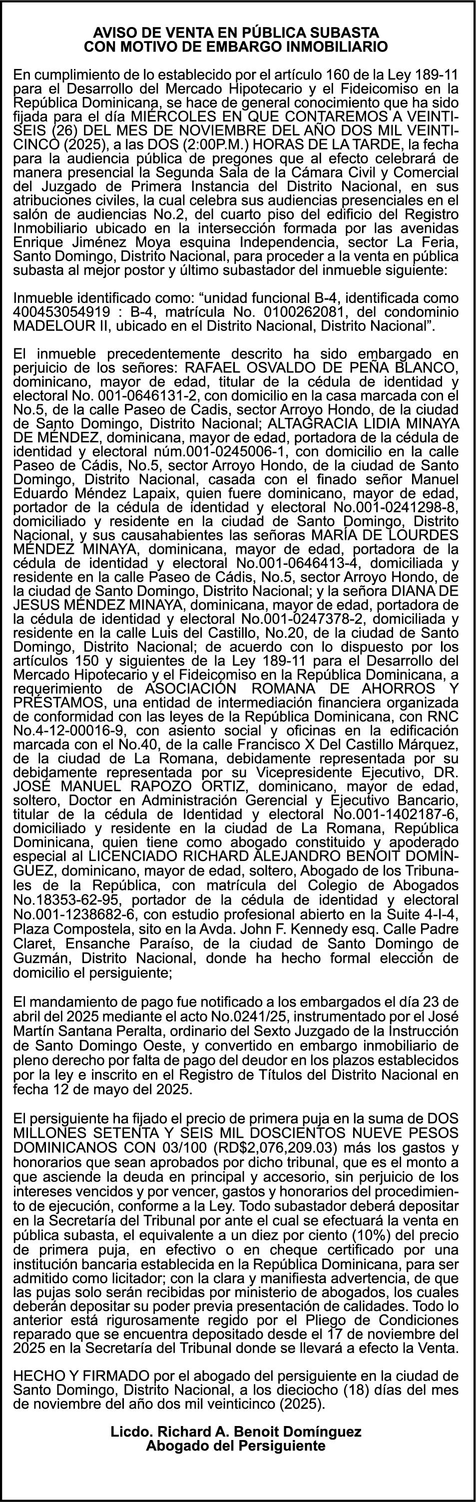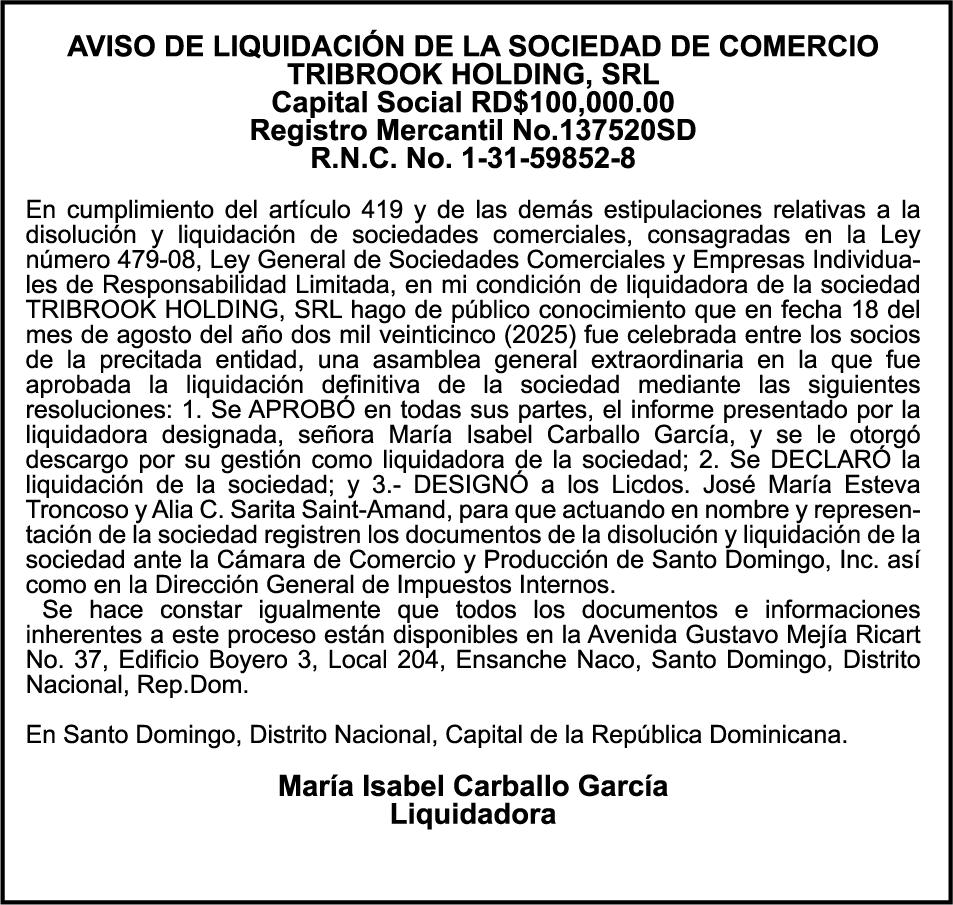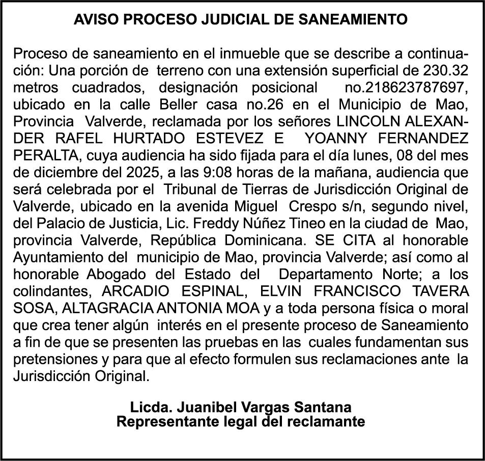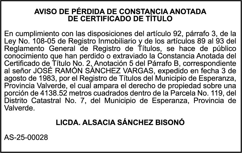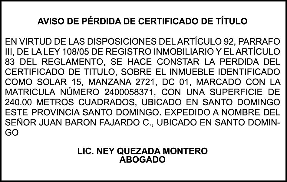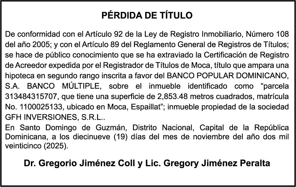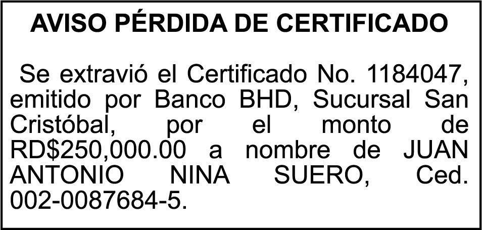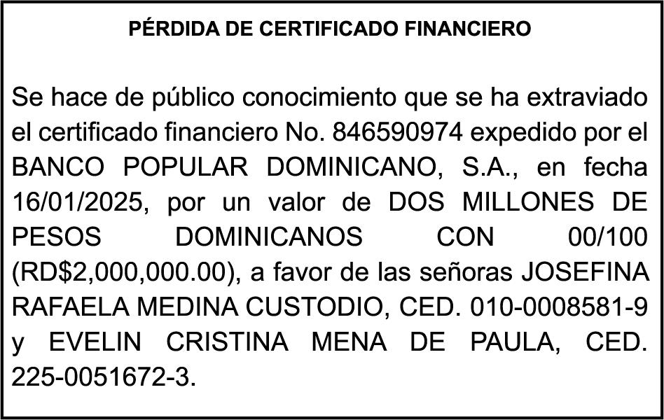 SE hace de público conocimiento la pérdida del Certificado Financiero número 835310137 emitido por Banco Popular Dominicano, S. A. Banco Múltiple, a nombre de HSIU-TU CHENG CHEN portador de la Cédula de Identidad y Electoral número 001-1274663-1 y WINSTON CHEN WANG portador de la Cédula de Identidad y Electoral número 402-4589950-1, certificado número 835310137 expedido en fecha en fecha 31 de julio de 2023 por el monto de (RD$494,656.47) más intereses generados a la fecha.