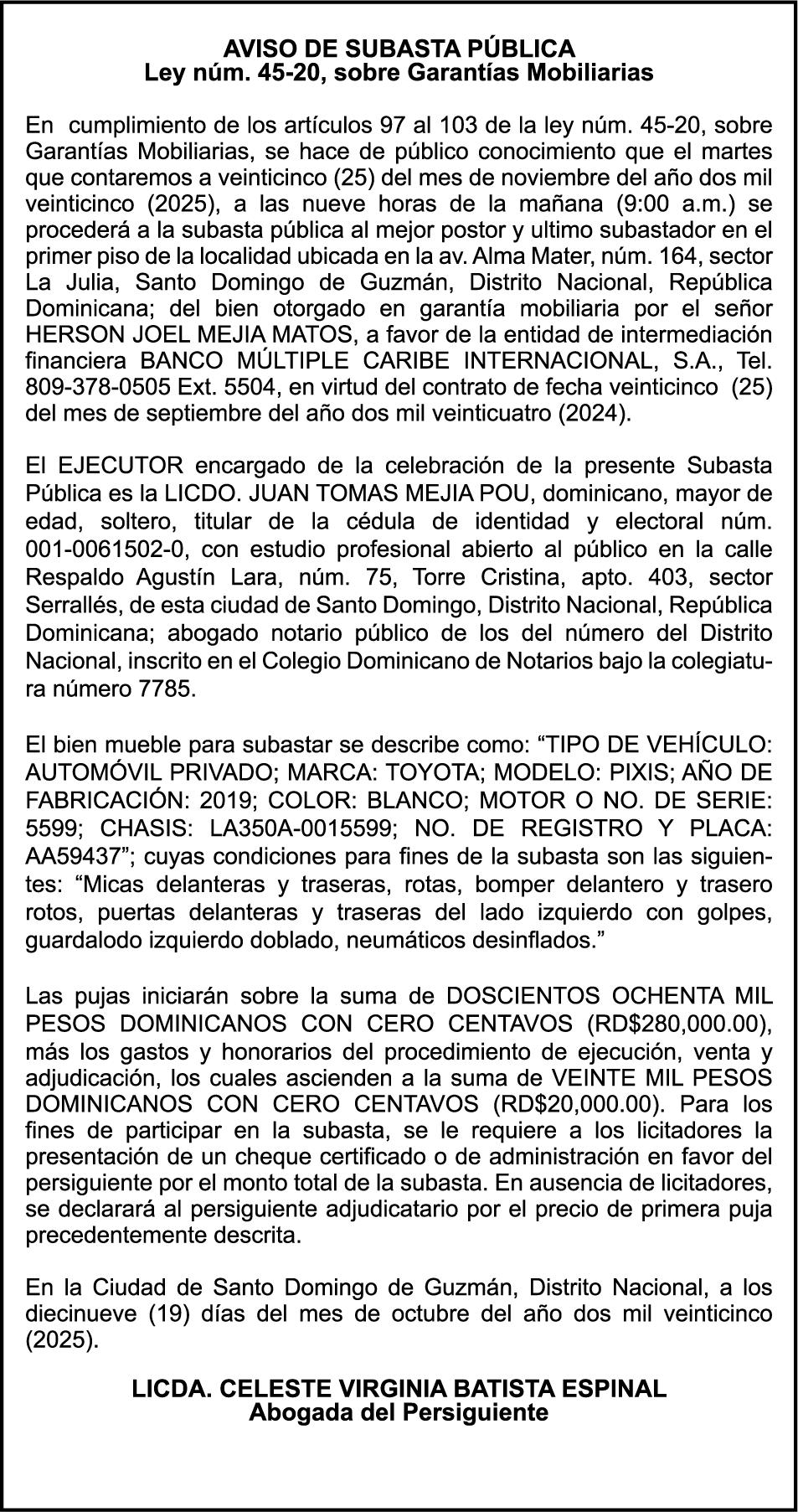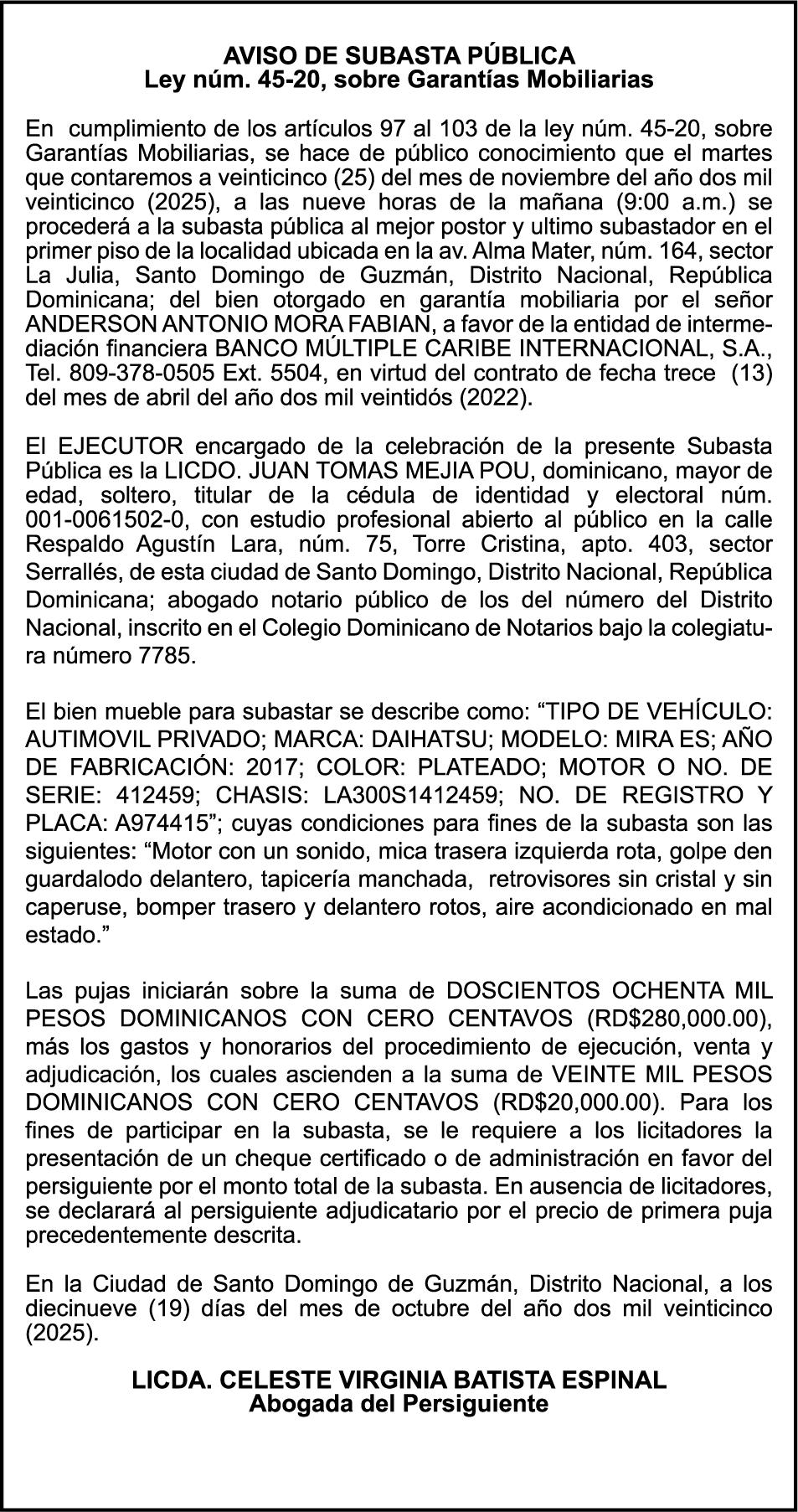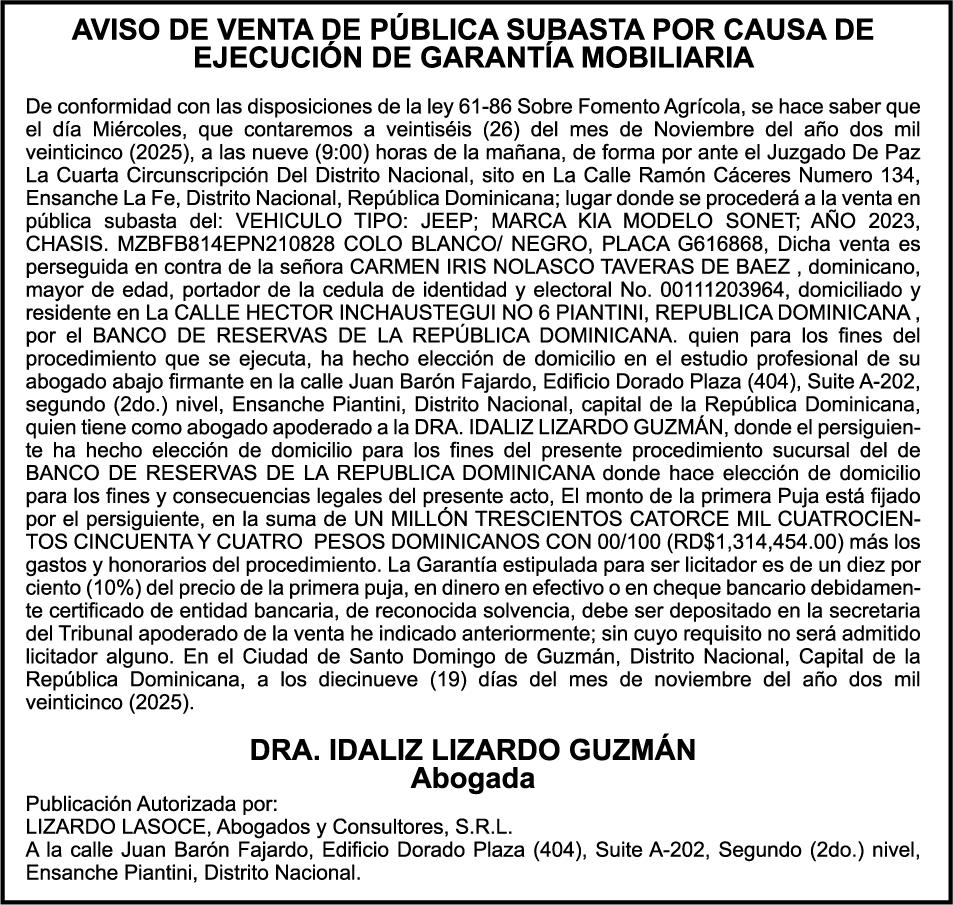 PERDIDA DE PLACA: NO.L254974, Chasis JDA00V11600027753, Marca DAIHATSU, Modelo V116L-HY/C, Color BLANCO, Año 2008, a nombre de C C AGROPECUARIA CAROLINA, S.A, RNC. 1-02-32779-3