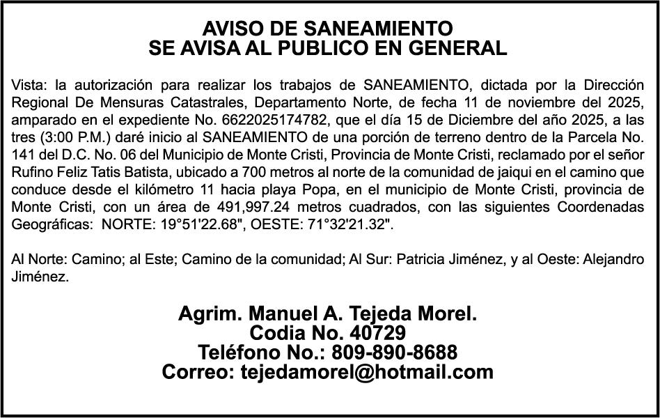 AVISO TRASPASO DE MEBARCACION.El señor NICOLAS CASTRO, traspasa la yola de recreo de nombre;TOMASITA; matricula No. YR-T3-189LR, de 23´0 pies de eslora, al señor.VICTOR MANUEL NUÑEZ, como nuevo propietario.