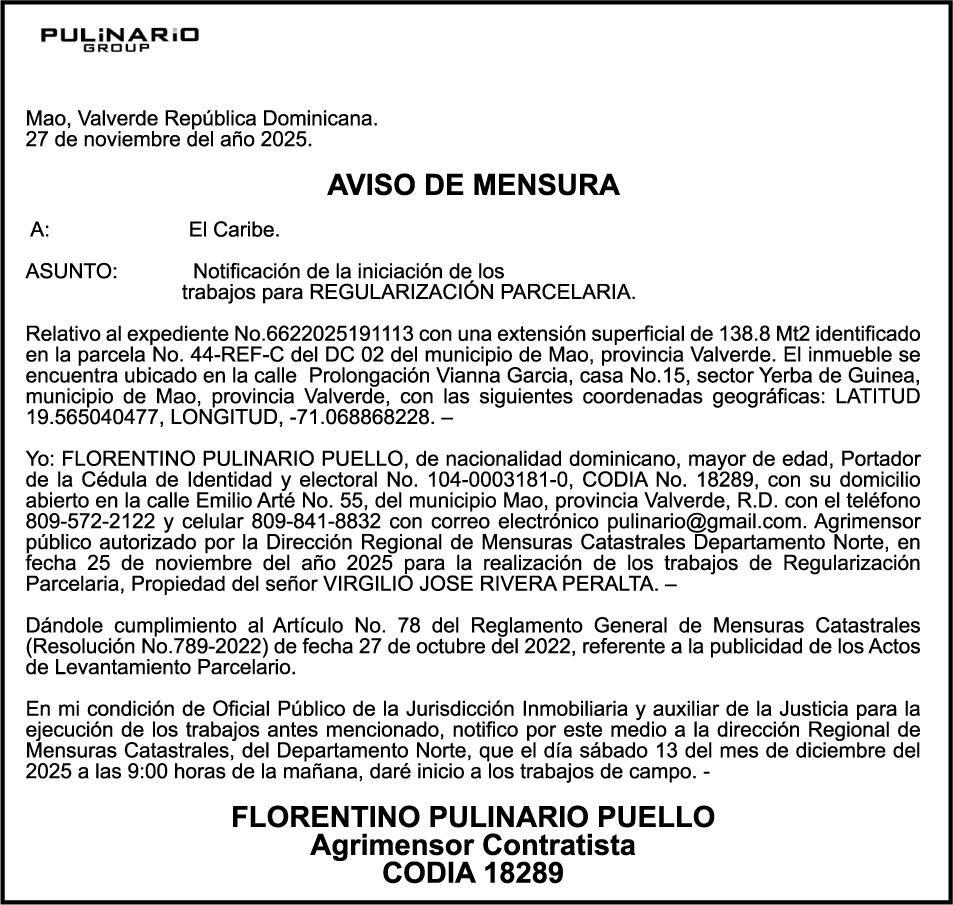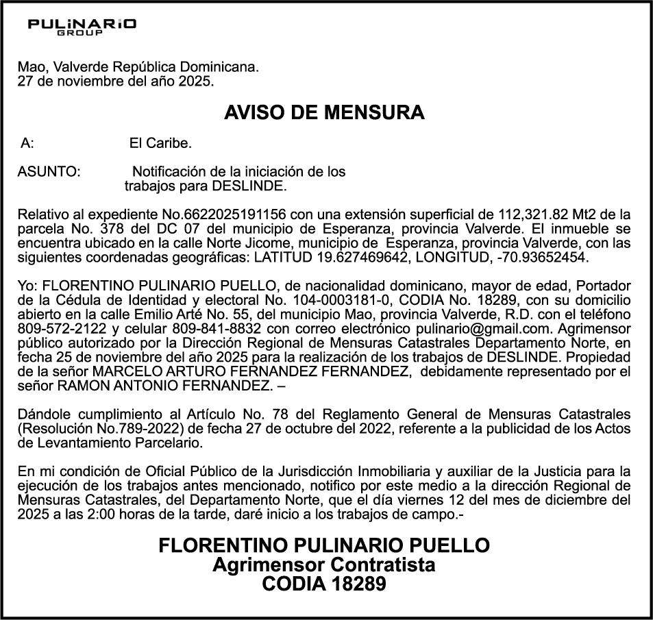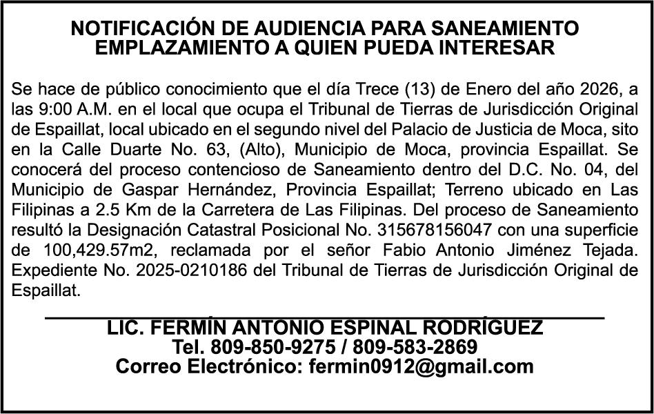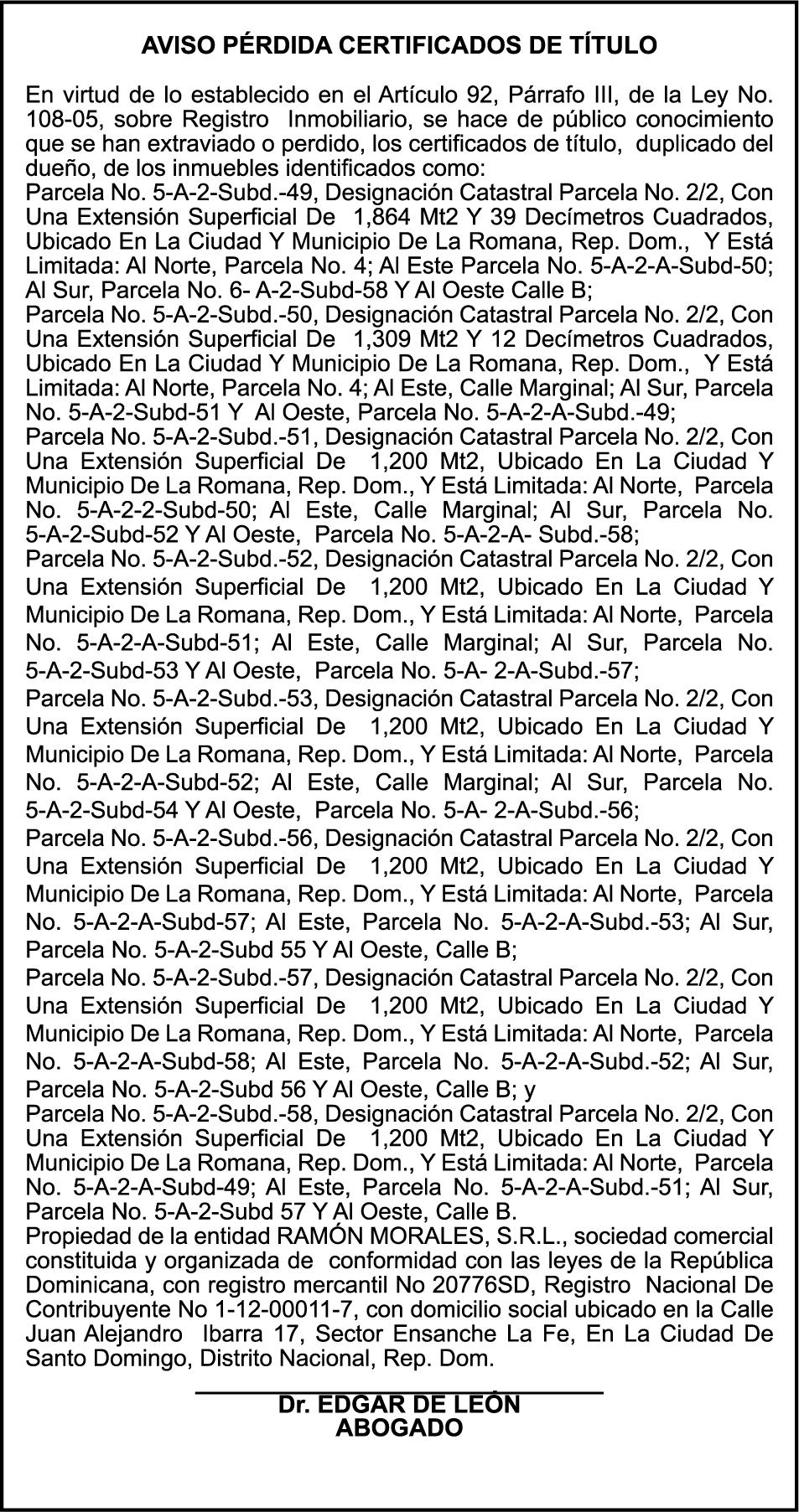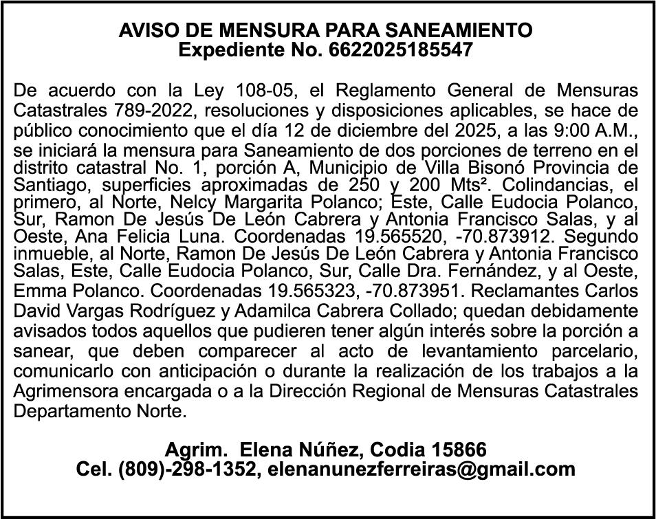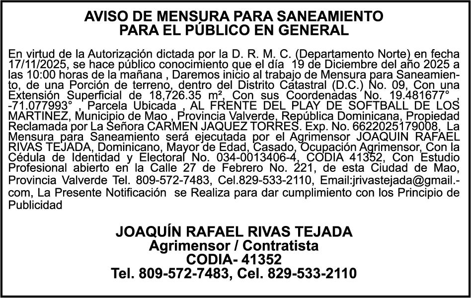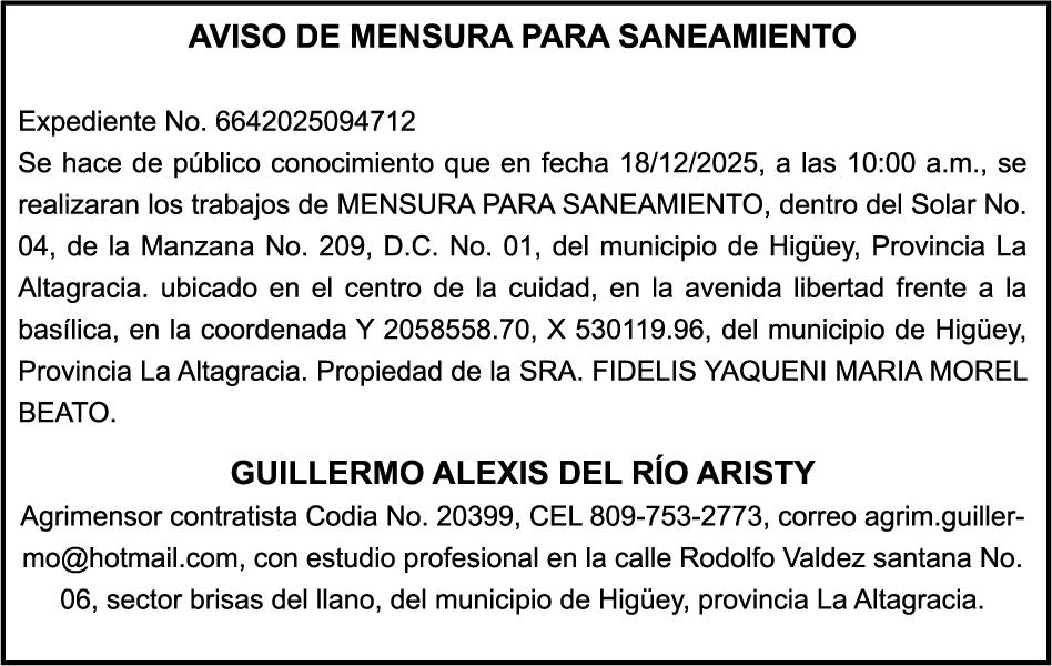 SE hace de público conocimiento la pérdida del Certificado Financiero número 850619255 emitido por Banco Popular Dominicano, S. A. Banco Múltiple, a nombre de JOAO MANUEL RIBEIRO SANJORGE, portador del pasaporte número PAS738908, certificado número 850619255 expedido en fecha en fecha 21 de julio de 2025 por el monto de (USD$6,949.31) más intereses generados a la fecha.