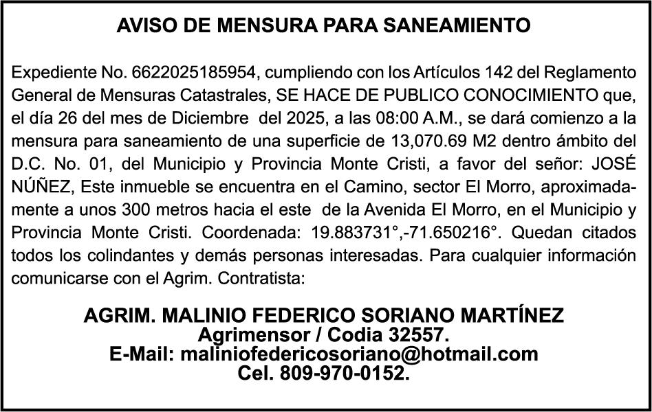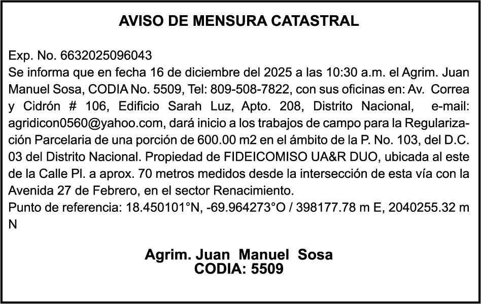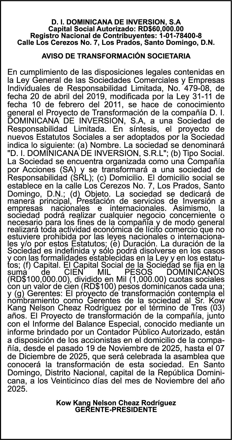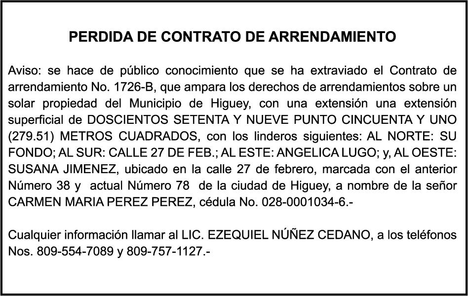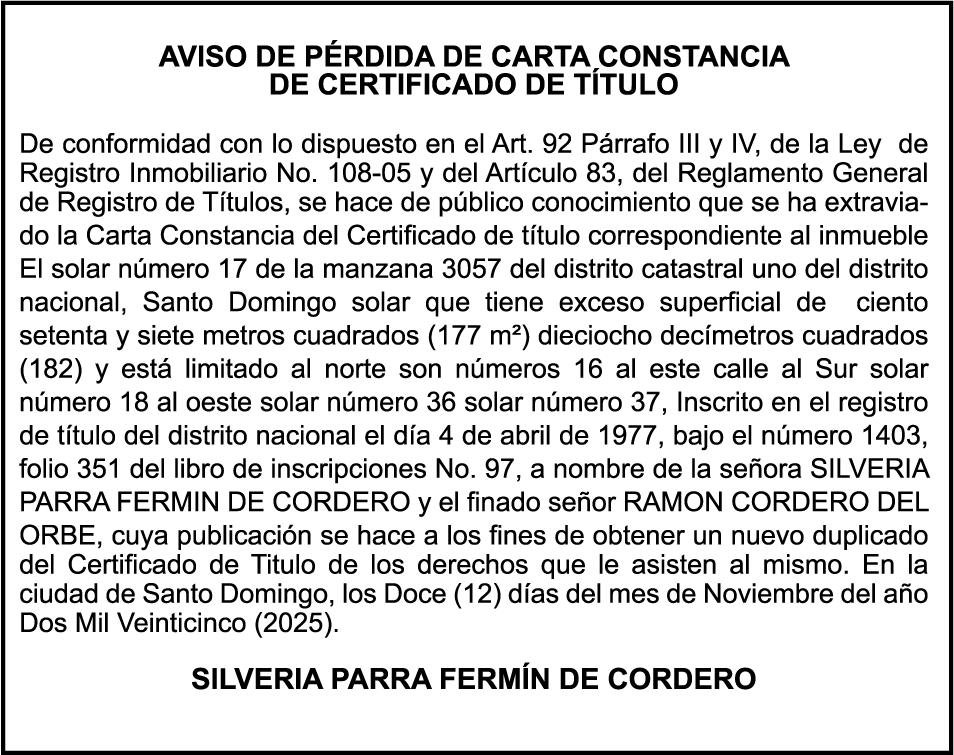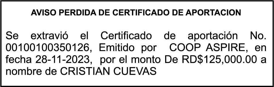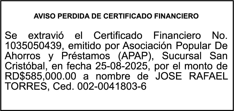 SE hace de público conocimiento la pérdida del Certificado Financiero número 850996554 emitido por Banco Popular Dominicano, S. A. Banco Múltiple, a nombre de ALBERTO CHALAS MARTINEZ, portador de la Cédula de Identidad y Electoral número 001-0595338-4, certificado número 850996554 expedido en fecha en fecha 7 de agosto de 2025 por el monto de (RD$3,000,000.00) más intereses generados a la fecha.