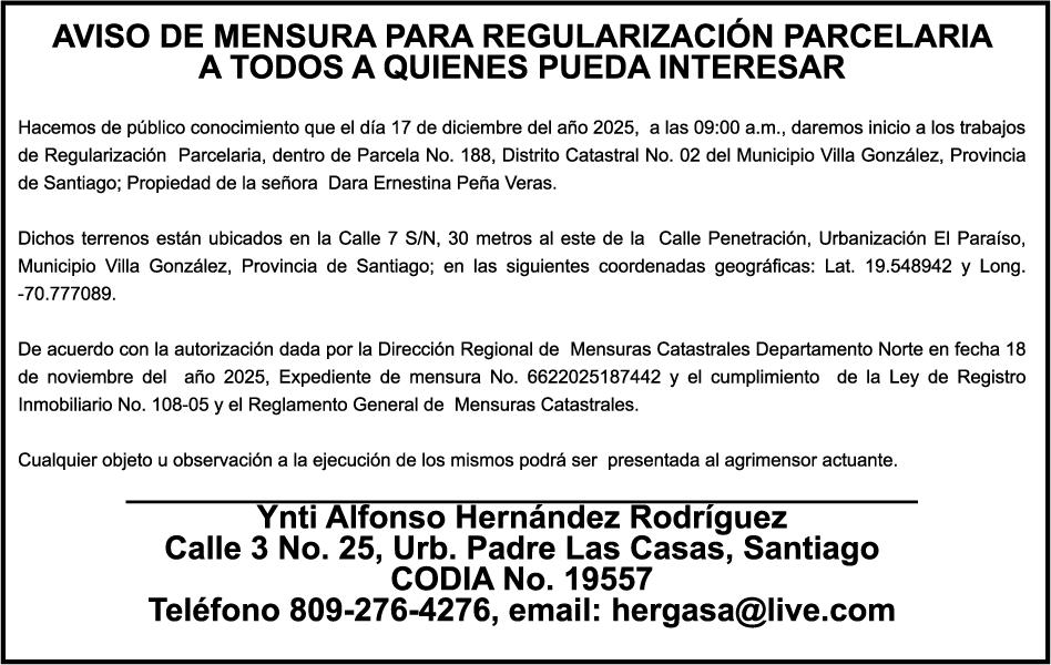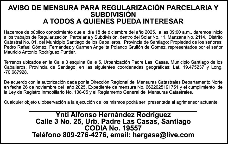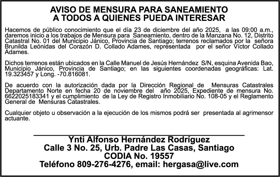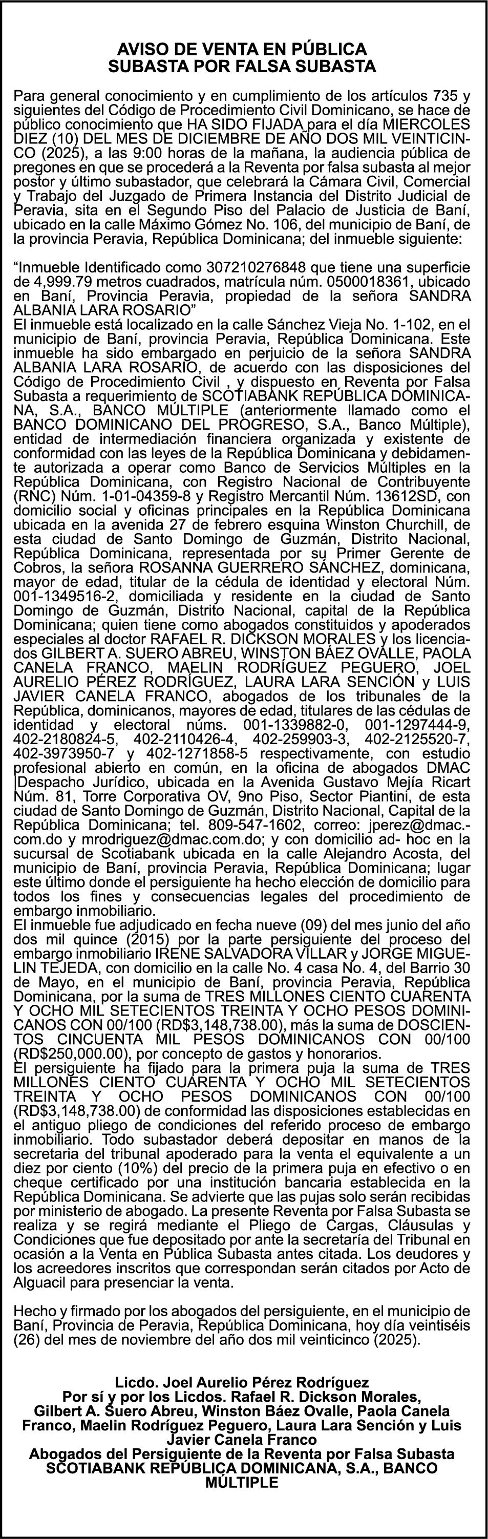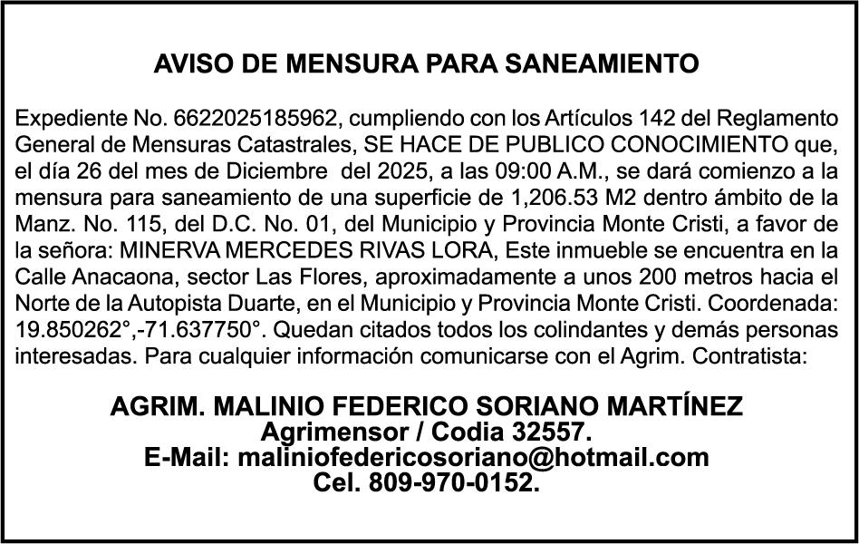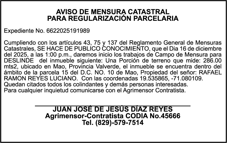 SE hace de público conocimiento la pérdida del Certificado Financiero número 850996554 emitido por Banco Popular Dominicano, S. A. Banco Múltiple, a nombre de ALBERTO CHALAS MARTINEZ, portador de la Cédula de Identidad y Electoral número 001-0595338-4, certificado número 850996554 expedido en fecha en fecha 7 de agosto de 2025 por el monto de (RD$3,000,000.00) más intereses generados a la fecha.