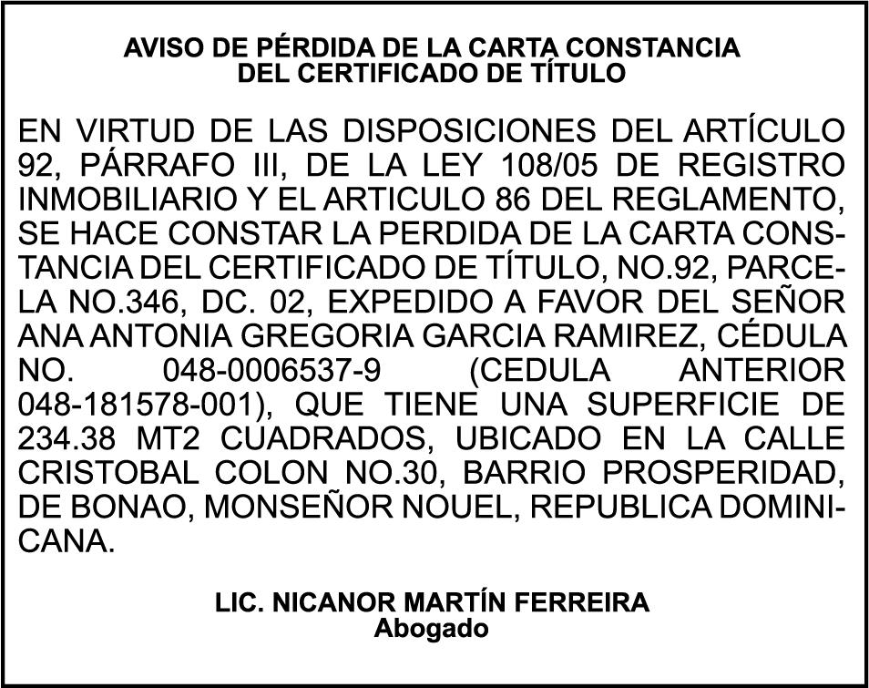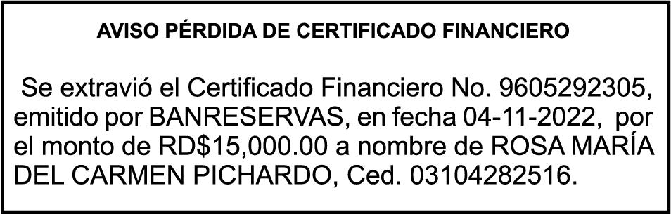 SE hace de público conocimiento la pérdida del Certificado Financiero número 848472122 emitido por Banco Popular Dominicano, S. A. Banco Múltiple, a nombre de ANYELO JOSE SANTANA RAMOS, portador de la Cédula de Identidad y Electoral número 023-0158873-3, certificado número 848472122 expedido en fecha en fecha 9 de abril de 2025 por el monto de (RD$155,107.77) más intereses generados a la fecha.
