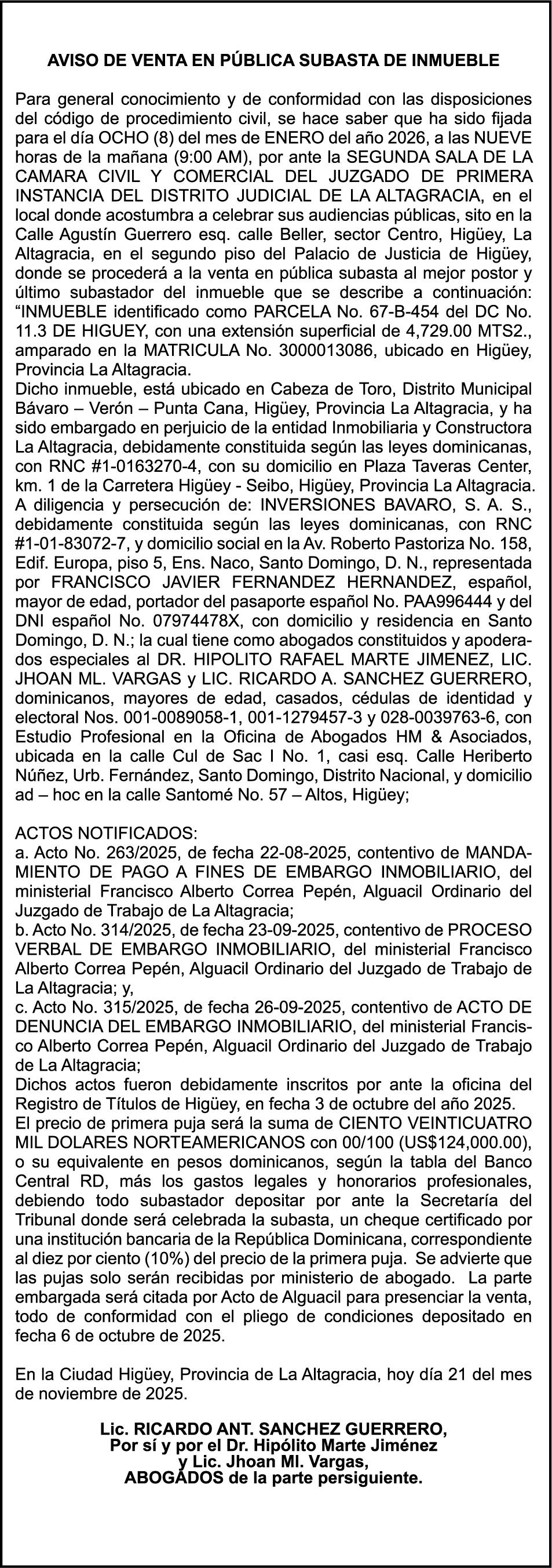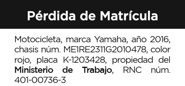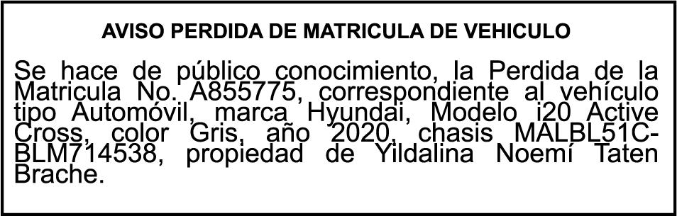 PERDIDA DE MATRICULA Automovil privado KIA, año 2010, color blanco, placa A668094, chasis KNAGH415BAA445511, a nombre de ISRAEL ACOSTA DE LA CRUZ PERDIDA DE PLACA No. K2536303, Motocicleta X-1000, Modelo CG150R6, Color azul, año 2023, Chasis TBLPCK4J9P2010471, a nombre de INVERSIONES MEGAMOTRIX SRL, RNC 1-32-11484-1.