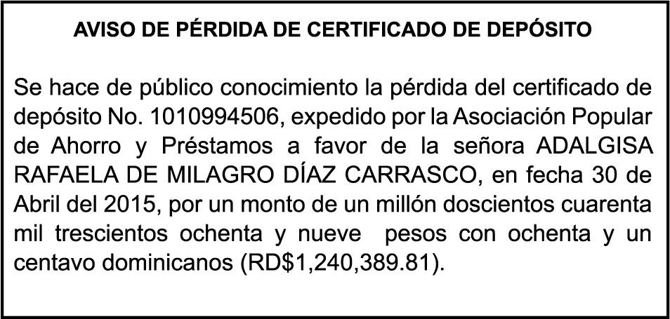 SE hace de público conocimiento la pérdida del Certificado Financiero número 780860839 emitido por Banco Popular Dominicano, S. A., a nombre de ADALGISA RAFAELA DEL M DIAZ CARRASCO, portadora de la Cédula de Identidad y Electoral número 001-0024481-3, certificado número 780860839 expedido en fecha 17 de junio del 2013 por el monto de (RD$2,778,213.61), más intereses generados a la fecha.