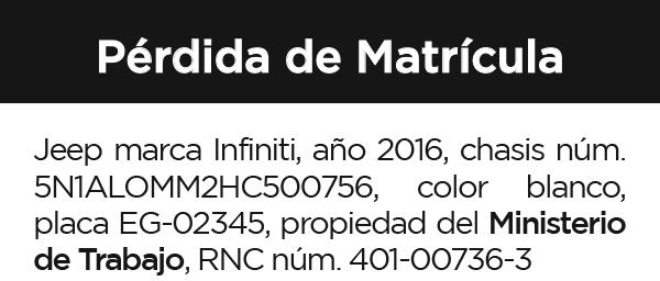 PERDIDA DE MATRICULA: Del Vehículo, Marca NISSAN, Modelo MURANO, Año 2016, Color GRIS, Placa G380719, Chasis 5N1TANZ52GN146430. A nombre de ALAIN MICHEL GAYRAL, Cédula 134-0003426-3.