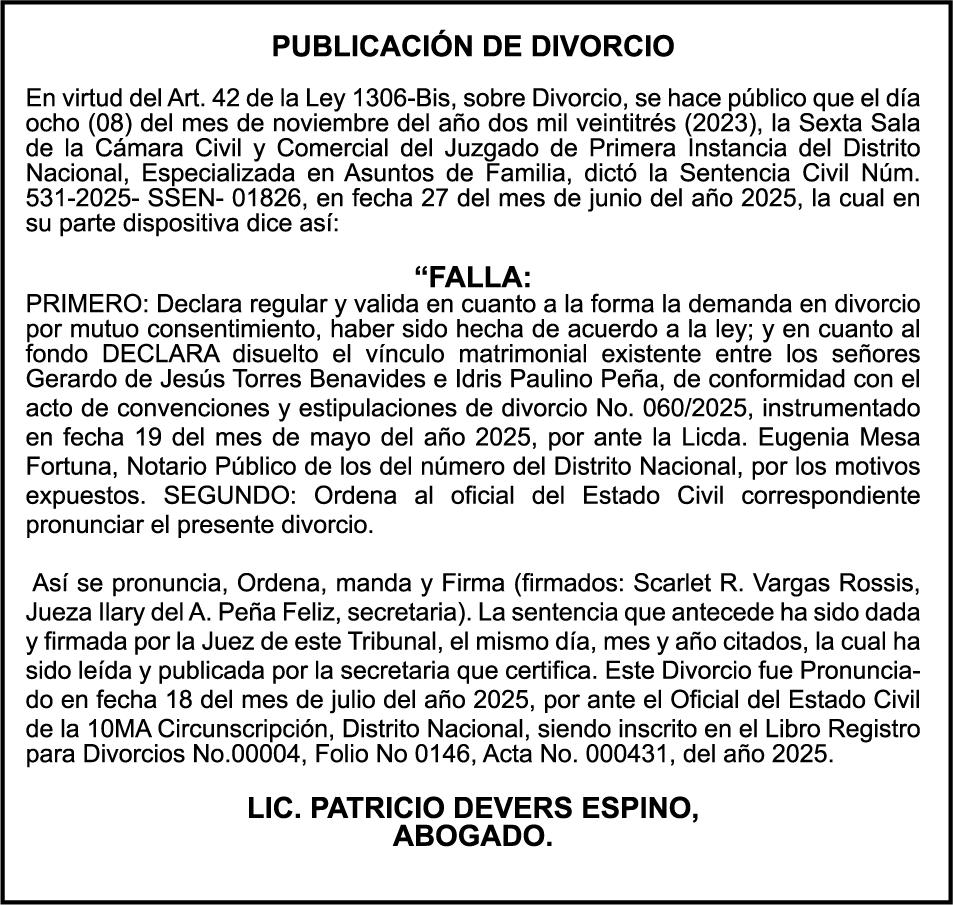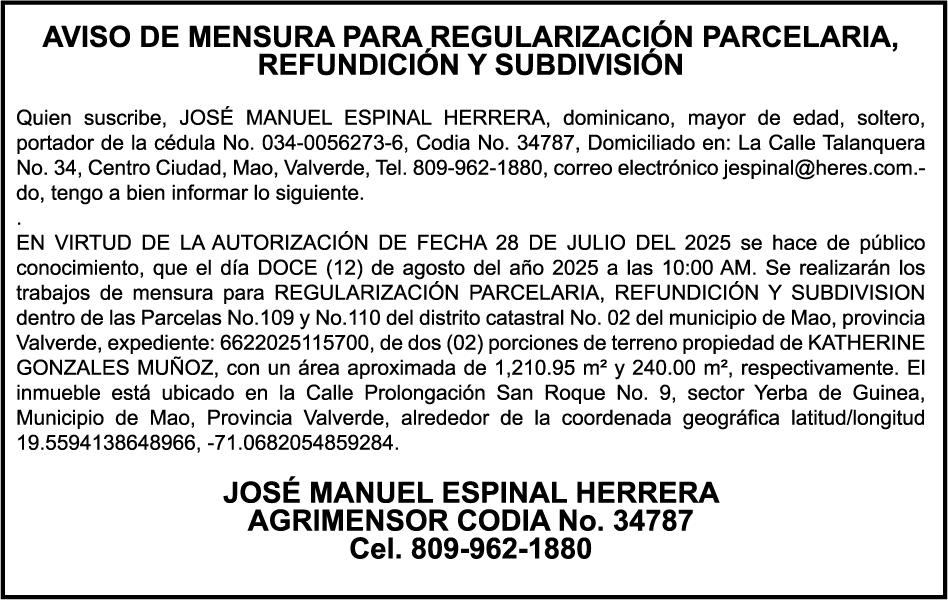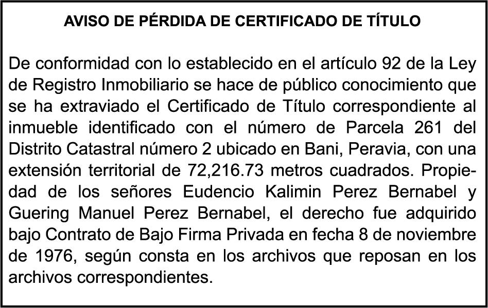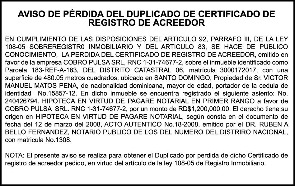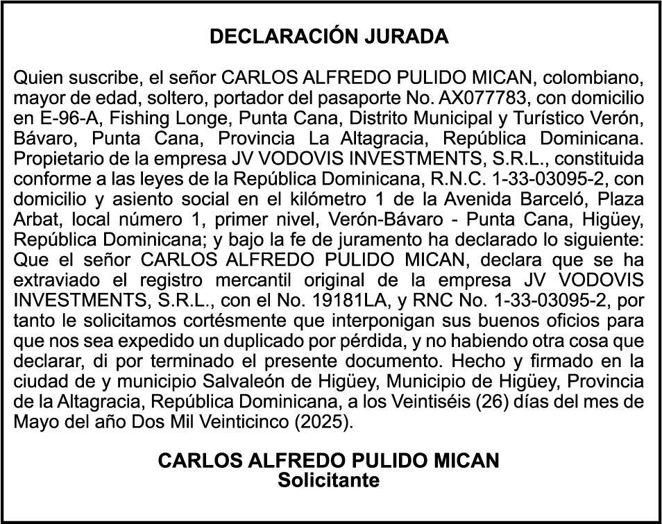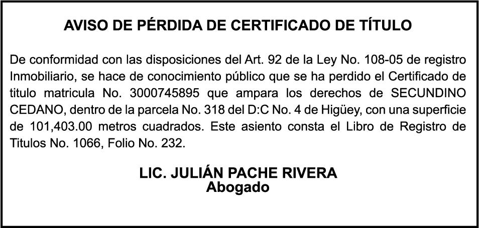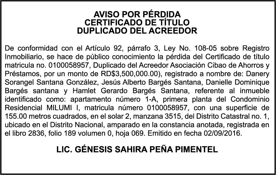 SE hace de público conocimiento la pérdida del Certificado Financiero número 849318324 emitido por Banco Popular Dominicano, S. A. Banco Múltiple, a nombre de JESUITA CASTILLO MARTINEZ DE CUEVAS, portadora de la Cédula de Identidad y Electoral número 028-0042517-1, certificado número 849318324 expedido en fecha 21 de mayo de 2025 por el monto de (RD$150,000.00) más intereses generados a la fecha.