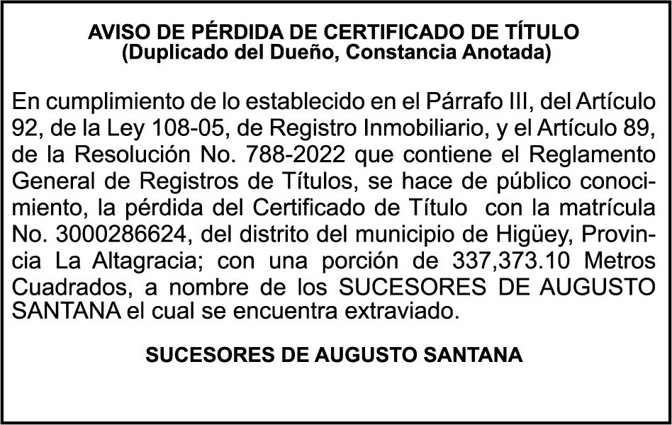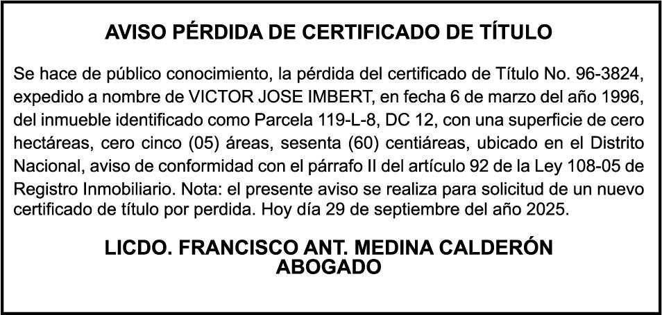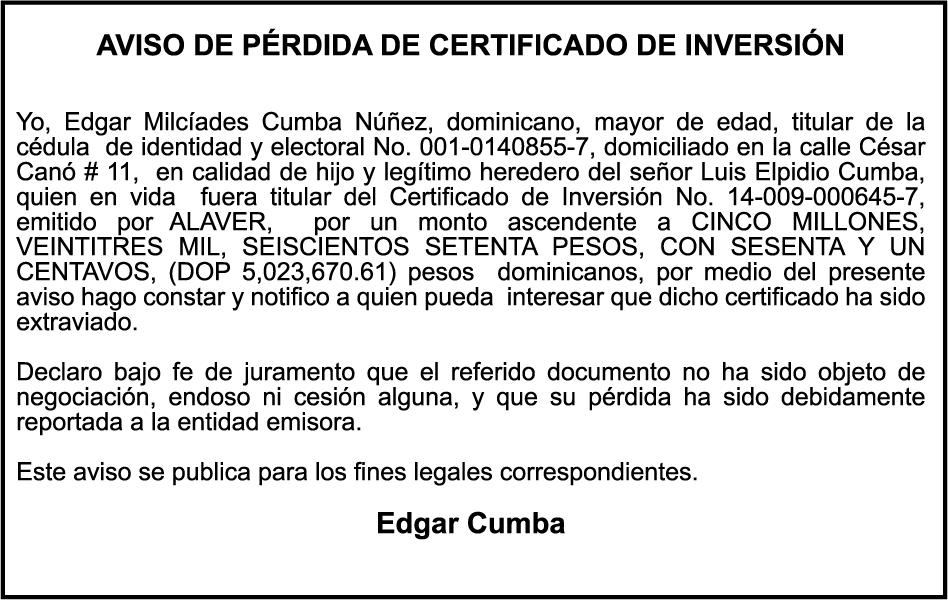 SE hace de público conocimiento la pérdida de certificado financiero No.41800061-2perteneciente al señor VICTOR MONTERO MONTERO, expedido por la cooperativa deahorros, créditos y servicios múltiple central, INC (coopcentrar) con el No. 35038 expedido en fecha 30/10/2020 por RD$ 150,000.00.1013