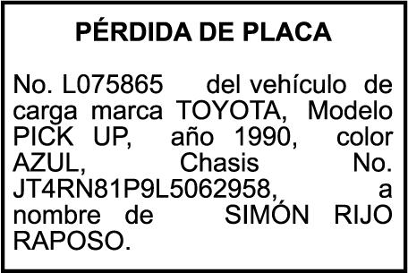 PERDIDA Matricula, Vehículo de Carga, Marca Toyota, Modelo PICK UP, 1989, AZUL,Placa L090158, CHASIS JT5VN94T8K0002674, Prop. Andrés Hernández Tejada