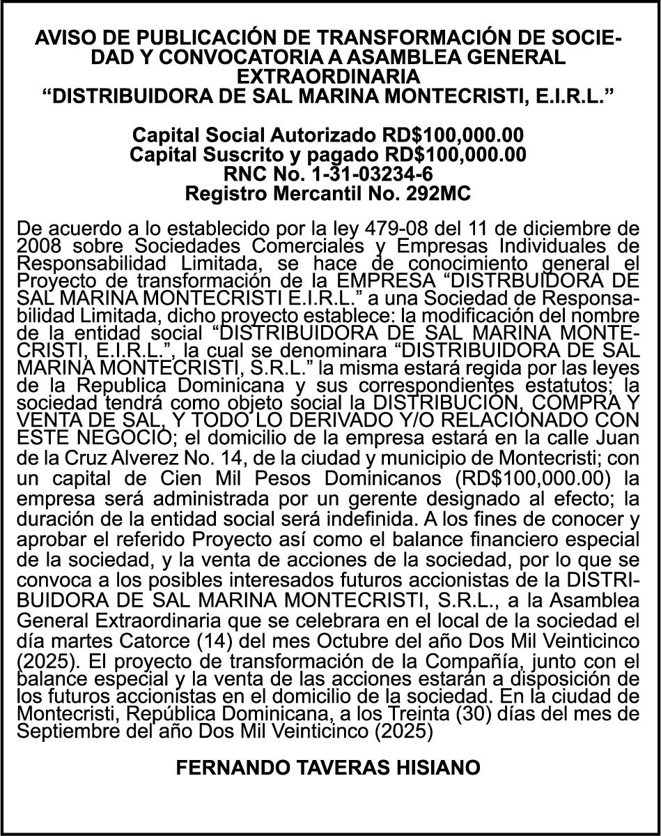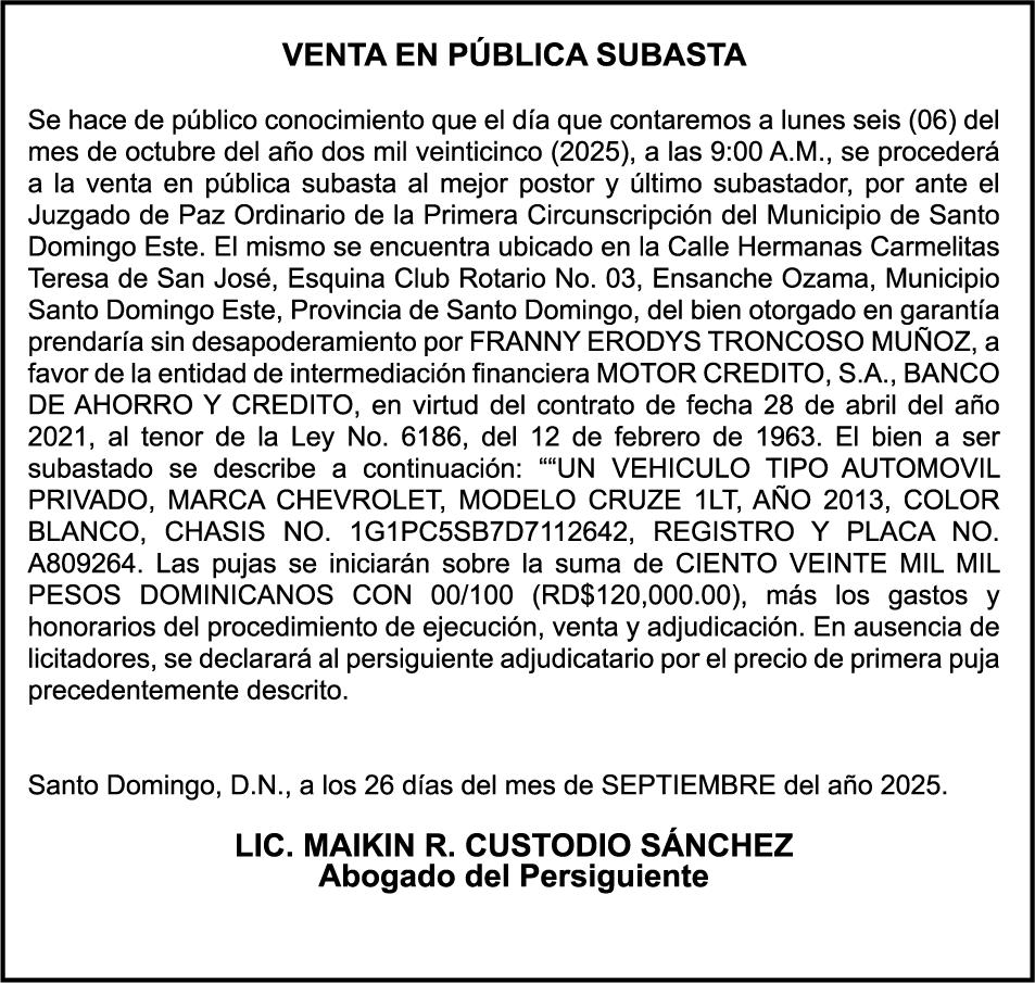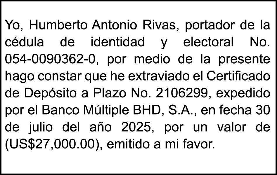 SE hace de público conocimiento la pérdida de certificado financiero No.41800061-2 perteneciente a la señora FLOR BETANIA VILORIO RIJO DE MONTERO, expedido por lacooperativa de ahorros, créditos y servicios múltiple central, INC (coopcentrar) con el No.35039 expedido en fecha 30/10/2020 por RD$ 450,000.00.