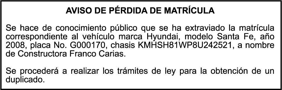 PERDIDA DE PLACA No. A812194, del vehículo marca HYUNDAI, Modelo SONATA año 2012, color GRIS, Chasis No. KMHEU41MBCA823089 a nombre de EDDY JUNIOR ECHAVARRIA KING