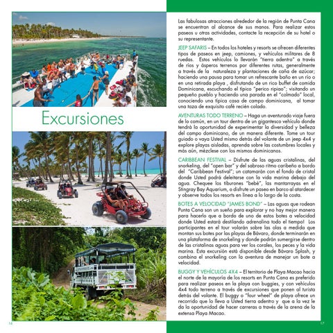 JEEP SAFARIS – En todos los hoteles y resorts se ofrecen diferentes tipos de paseos en jeep, camiones, y vehículos militares de 8 ruedas. Estos vehículos lo llevarán “tierra adentro” a través de ríos y ásperos terrenos por diferentes rutas, generalmente a través de la naturaleza y plantaciones de caña de azúcar; haciendo una pausa para tomar un refrescante baño en un río o en una retirada playa , disfrutando de un rico buffet de comida Dominicana, escuchando el típico “perico ripiao”; visitando un pequeño pueblo y haciendo una parada en el “colmado” local, conociendo una típica casa de campo dominicana, al tomar una taza de exquisito café recién colado. AVENTURAS TODO TERRENO – Haga un aventurado viaje fuera de lo común, en un tour dentro de un gigantesco vehículo donde tendrá la oportunidad de experimentar la diversidad y belleza del campo dominicano, de un manera diferente. Tome un tour guiado o vaya Usted mismo detrás del volante de un jeep 4x4 y explore playas aisladas, aprenda sobre las costumbres locales y más aún, mézclese con los mismos dominicanos. Caribbean Festival – Disfrute de las aguas cristalinas, del snorkeling, del “open bar” y del sabroso ritmo caribeño a bordo del “Caribbean Festival”; un catamarán con el fondo de cristal donde Usted podrá deleitarse con la vida marina debajo del agua. Chequee los tiburones “bebé”, las mantarrayas en el Stingray Bay Aquarium, o disfrute un paseo en barco al atardecer y observe todos los resorts en línea a lo largo de la costa. BOTES A VELOCIDAD “JAMES BOND” – Las aguas que rodean Punta Cana son un sueño para explorar y no hay mejor manera para hacerlo que a bordo de uno de estos botes a velocidad donde Usted estará destilando adrenalina todo el tiempo! Los participantes en el tour volarán sobre las olas a medida que montan sus botes por las playas de Bávaro, donde terminarán en una plataforma de snorkeling y donde podrán sumergirse dentro de las cristalinas aguas para ver los corales, los peces y la vida marina. Esta excursión está disponible desde Bávaro Splash, y combina el snorkeling con la aventura de manejar un bote a velocidad. Buggy y Vehículos 4x4 – El territorio de Playa Macao hacia el norte de la mayoría de los resorts en Punta Cana es preferido para realizar paseos en la playa con buggies, y con vehículos 4x4 todo terreno a través de excursiones que ponen al turista detrás del volante. El buggy o “four wheel” de playa ofrece un recorrido que lo lleva a Usted tierra adentro y que a la vez le da la oportunidad de hacer carreras a través de la arena de la extensa Playa Macao.