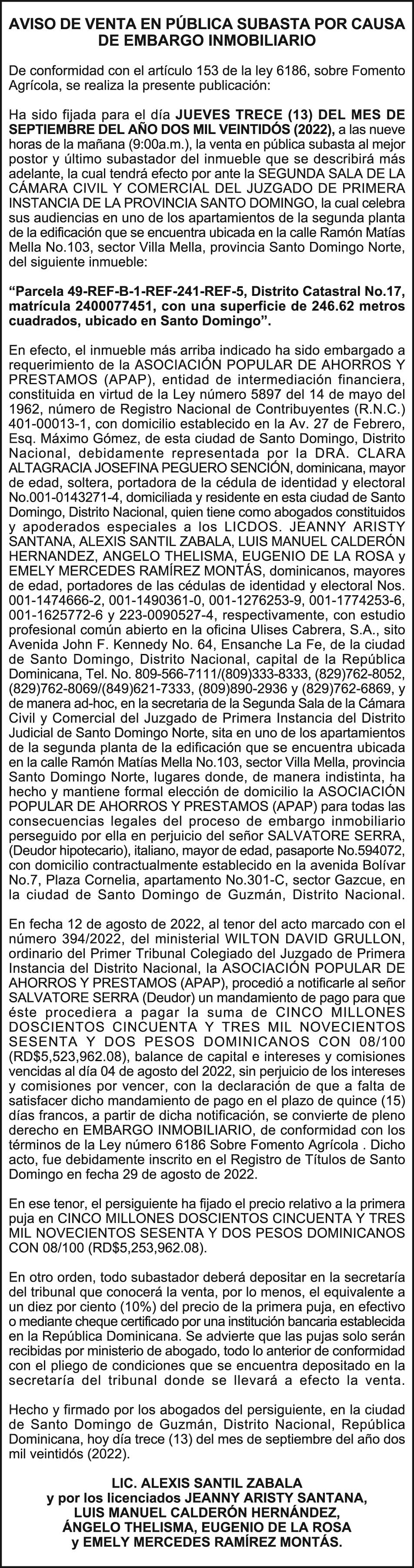 SE hace de público conocimiento, que en fecha 09 de mayo de 2022, los señores ROMAN ABREU MARTINEZ y JUANA NUÑEZ GARRIDO DE ABREU, vendieron a NARCISO JIMENEZ, la embarcación Sea Fox, Matricula BR-S117-1425LR, puerto de La Romana, Casco No. LYGHE1321809, Color blanco y Azul, 23.3 de eslora, 8.6 de manga, 4.0 de puntal, construida en fibra de vidrio, según acto de venta legalizado por el notario publico de Higüey LIC. MANUEL DE JESUS GUERRERO