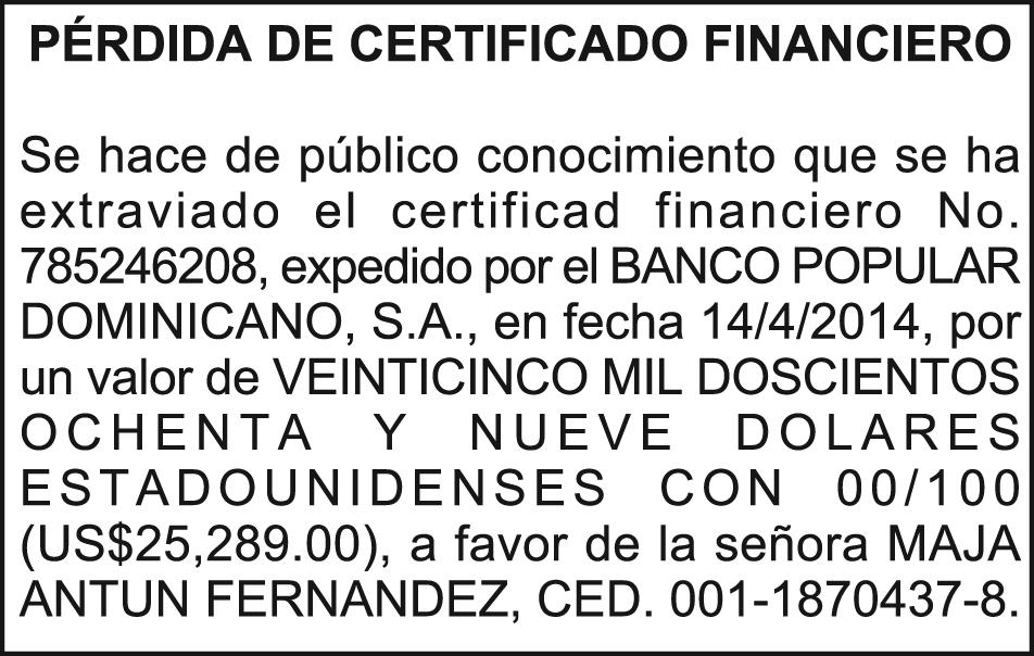 SE hace de público conocimiento las pérdidas de certificados de depósito números 779298637 y 811511880 emitido por Banco Popular Dominicano, S. A., a favor de MERCEDES FELIZ SALDAÑA, portadora de la Cédula de Identidad y Electoral número 001-0162575-4, expedido en fecha 7 de marzo de 2013 por el monto de (US$40,806.10), y el segundo expedido fecha 16 de enero de 2019 por el monto (RD$300,000.00), capital más intereses generados a la fecha.