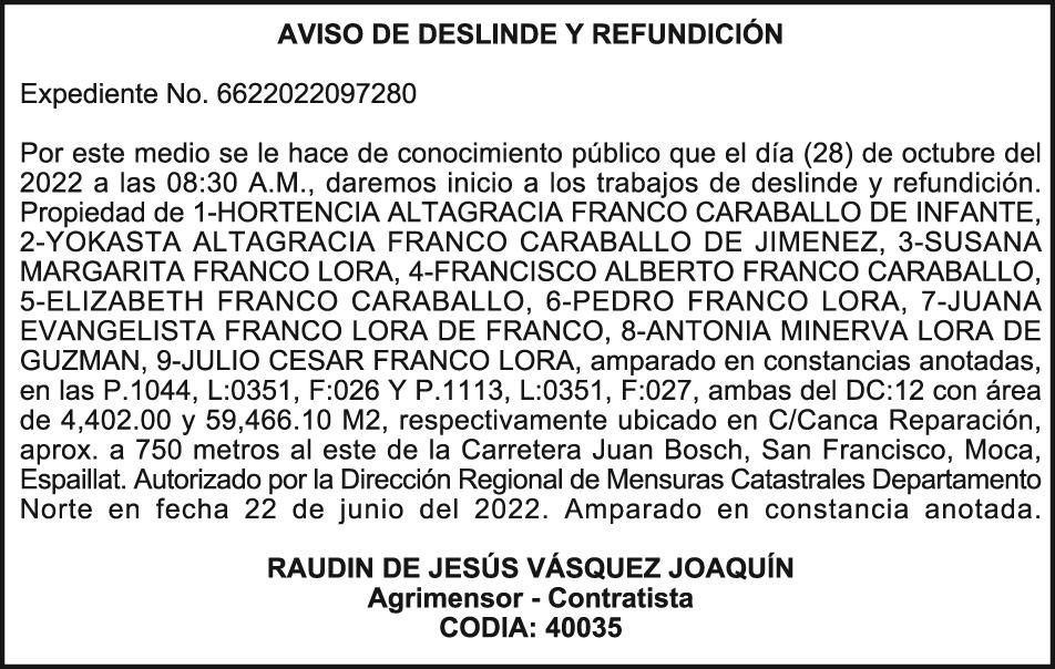 SE LE INVITA Al Sr. ROBERTO GONZALEZ RODRIGUEZ, Ced. No. 058-0028818-4, a comparecer ante la Fiscalía Del Plan Piloto, ubicado en la Av. Correa y Cidron, esq. Ecuador, sector Honduras, D.N. Tel. 809-532-4051, a los fines de que proceda a realizar el retiro de la denuncia sobre la sustracción de la Motocicleta marca Marca X-1000, modelo CG-200, año 2014, color negro, placa K0266397, chasis TBL20P105EHE57050.