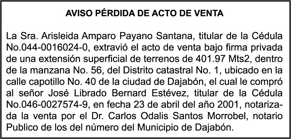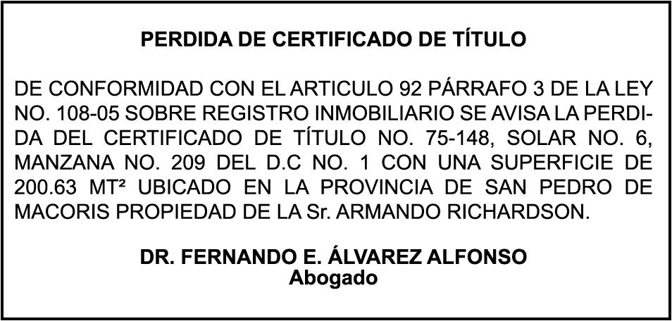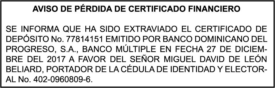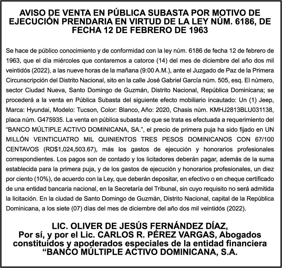 PERDIDA DE MATRICULA Veh. Carga HINO, color blanco, año 2022, placa L443225, chasis JHDFC3JJJMXX12210, a nombre de BANCO POPULAR DOMINICANO S.A. BANCO MULTIPLE.