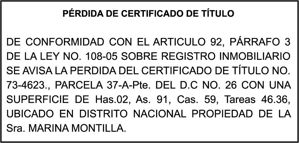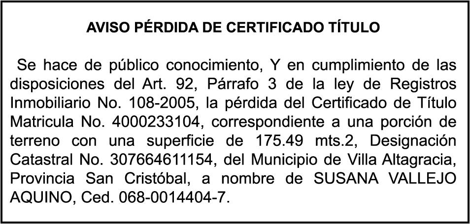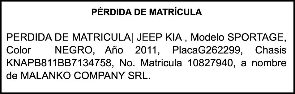 PERDIDA DE MATRICULA:Del Vehiculo, Placa L425930, Chasis 3N6CD33B7ZK428439, Marca NISSAN, Modelo FRONTIER NP300 2CAB 4X4, Color BLANCO, AñO 2022,a nombre de JOSE DEL CARMEN UREÑA ADAMES, Ced. 03100859689