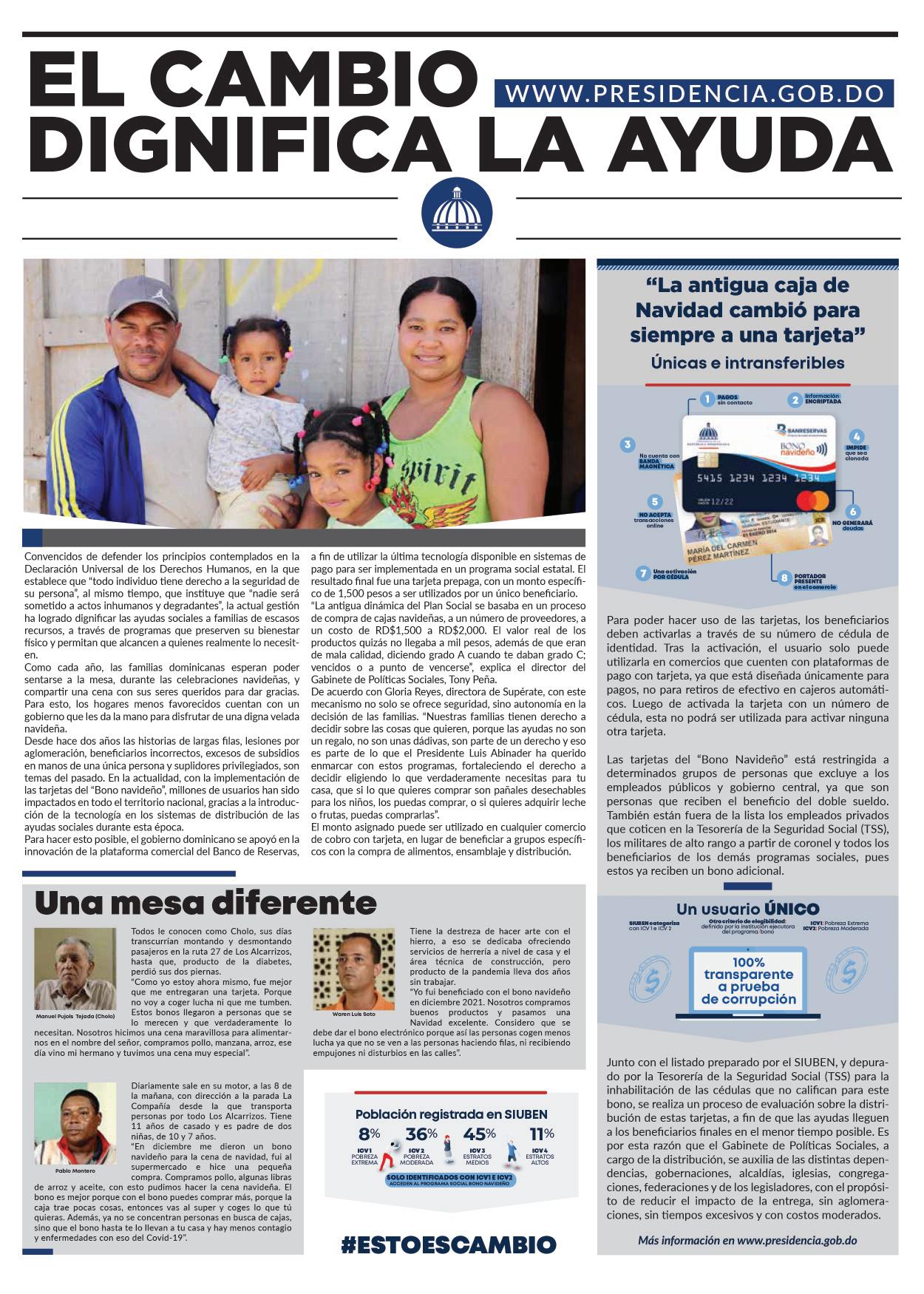 EL GOBIERNO repartirá RD$3 mil millones distribuidos en dos millones de tarjetas, en una iniciativa concebida supuestamente para que los pobres no hagan filas ni se apretujen “indignamente”, como ocurría con las cajas que entregaba el PLD. Loable intención, pero que corrijan fallos del año pasado tan o más indignantes que los pobres se apretujen pugnando por una caja, y es que las tarjetas también sirvieron para beneficiar a senadores, diputados, alcaldes y hasta regidores, que repartieron esas tarjetas entre sus allegados, y hasta con un gran escándalo por los millones que regaló Peña Guaba a artistas. Aunque el PRM hace trampa, pues habla mal de las cajas pero anuncia para este mes, como lo hacía el PLD, la entrega de 6.3 millones de raciones crudas y cocidas. ¡Navidad pal’ pueblo!