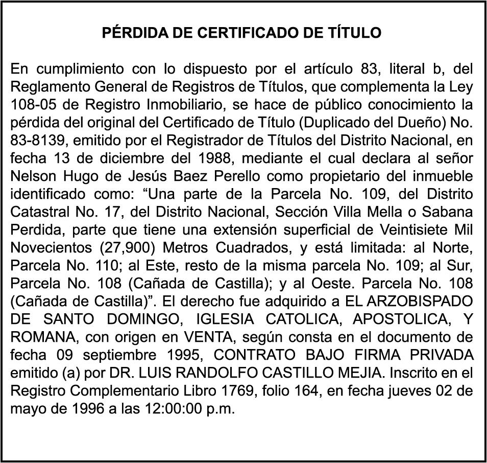 SE hace de público conocimiento la pérdida de certificado de depósito número 822931200 emitido Banco Popular Dominicano, S. A., a favor de FRANCISCO ALBERTO OTTENWALDER YSABEL Portador de la Cédula de Identidad y Electoral número 402-26638894, expedidos en fecha 14 de julio de 2021 por el monto de (RD$29,960.36), de capital más intereses generados a la fecha.