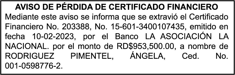 SE hace de público conocimiento la pérdida de certificado de depósito número 2115017525 emitido por Banco Popular Dominicano, S. A., a favor de DAYSI ELENA BAEZ SANTANA Cedula de identidad y Electoral número 4022358779-7, expedido en fecha 24 de junio de 1996 por el monto de (RD$17,329.47), más intereses generados a la fecha.